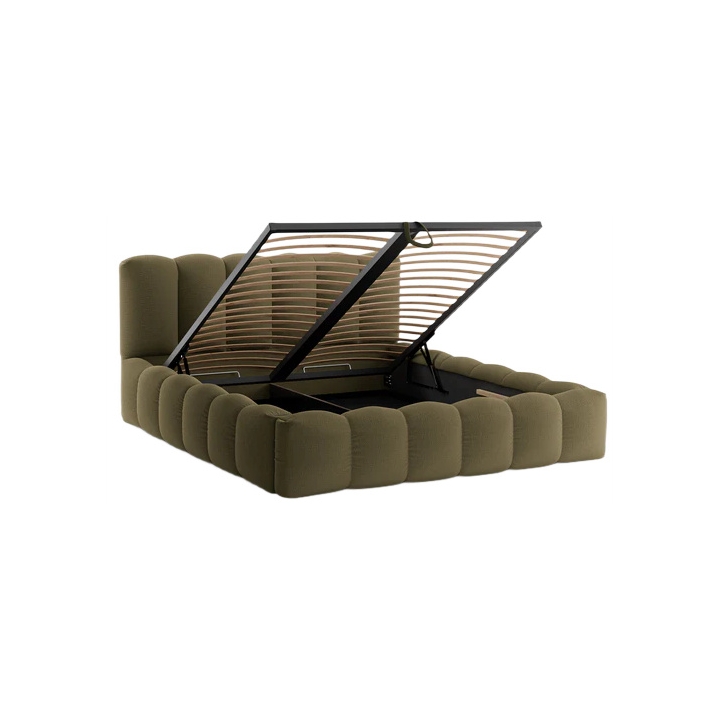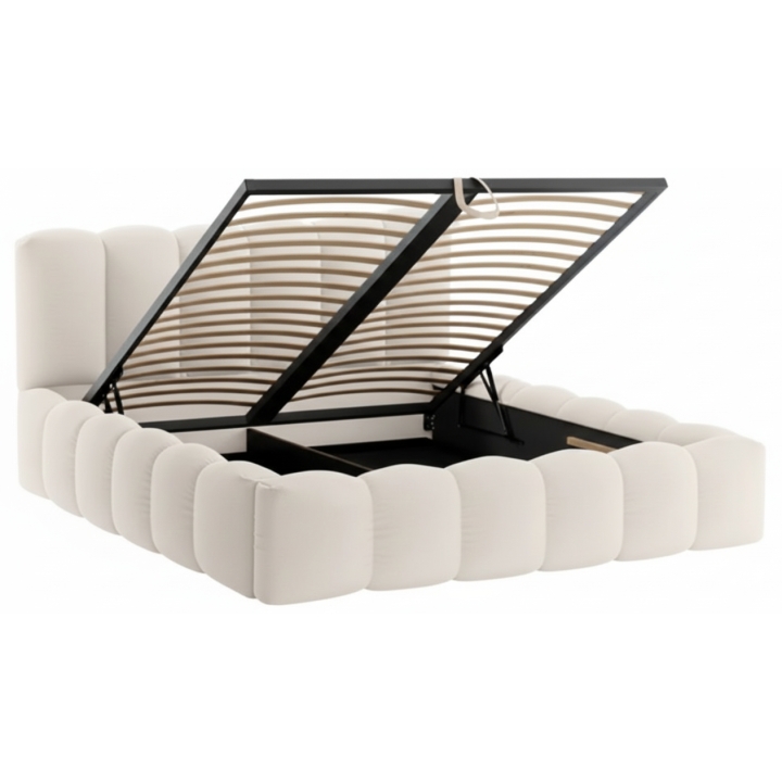 A major functional advantage is the large bedding storage compartment located beneath the mattress. This front-opening storage box allows neat and discreet organisation of bedding, blankets, and textiles. The maximum load capacity is 7 kg. Thanks to the gas-lift system, opening the slatted frame is smooth, safe, and effortless.