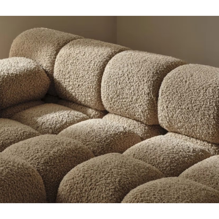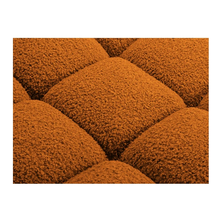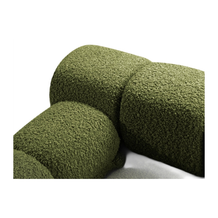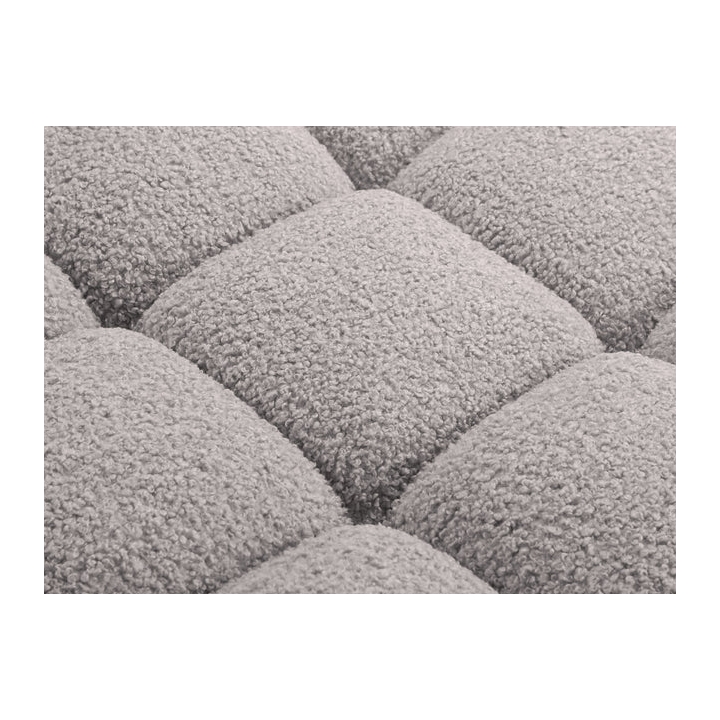 A distinctive texture is provided by the Rolf upholstery fabric, a type of structured bouclé. This material closely resembles sheepskin, with numerous small, wool-like loops on the surface.