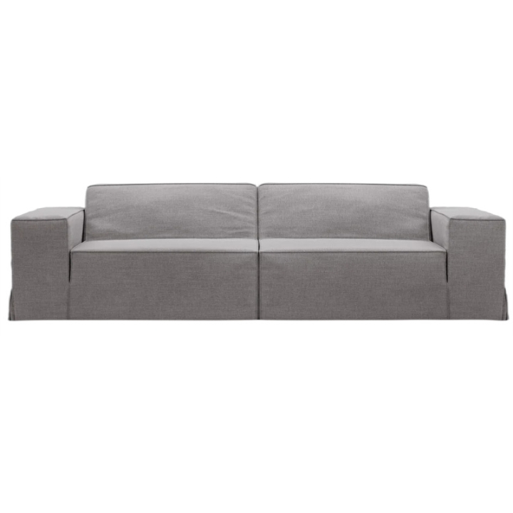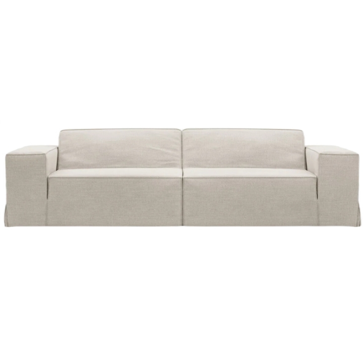The sofa is upholstered in Lins structural fabric with a flat weave and a natural linen blend. This material creates a distinctive melange effect, visually reminiscent of denim, with a subtle, fine texture on the surface.
