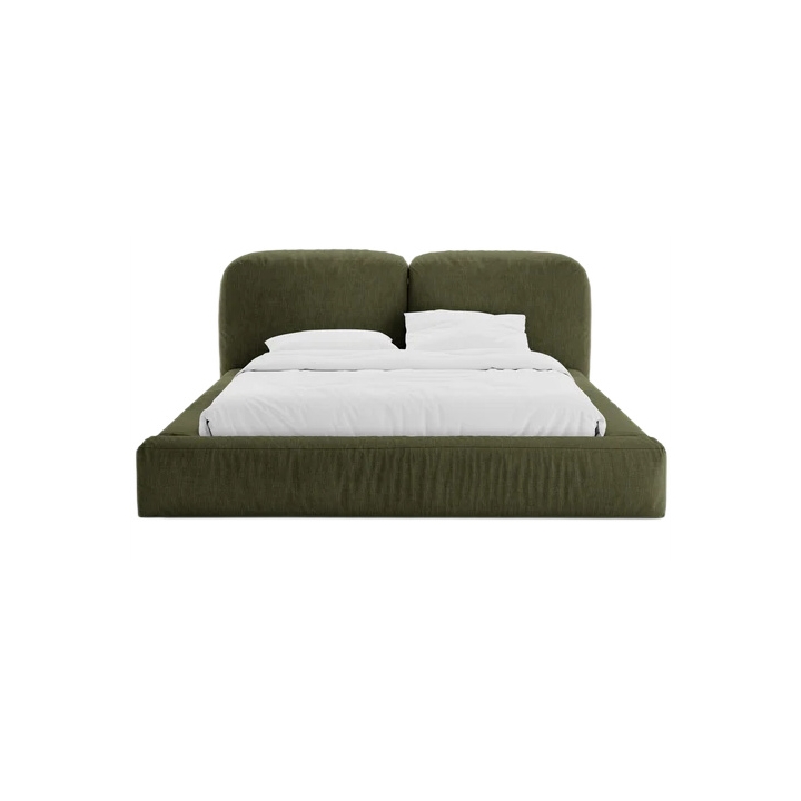 A defining feature of the bed is the double headboard, composed of two wide upholstered panels. This design provides a stable and soft backrest, perfect for evening reading or daytime rest. The look is completed by a wide, plush frame that surrounds the mattress, giving the bed an enveloping appearance and a sense of exceptional comfort.