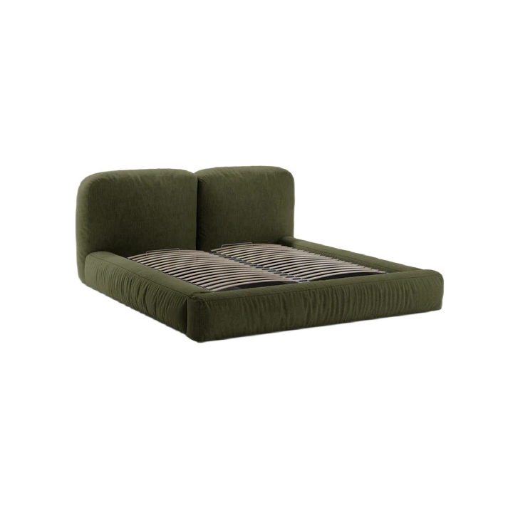 The most eye-catching feature is the double headboard, formed by two wide upholstered panels. This element serves as a comfortable backrest, allowing you to relax in a seated position, for example while reading. The mattress is surrounded by a wide, plush frame, which gives the entire structure a light and soft appearance. This design makes the bed feel enveloping and exceptionally pleasant in everyday use.