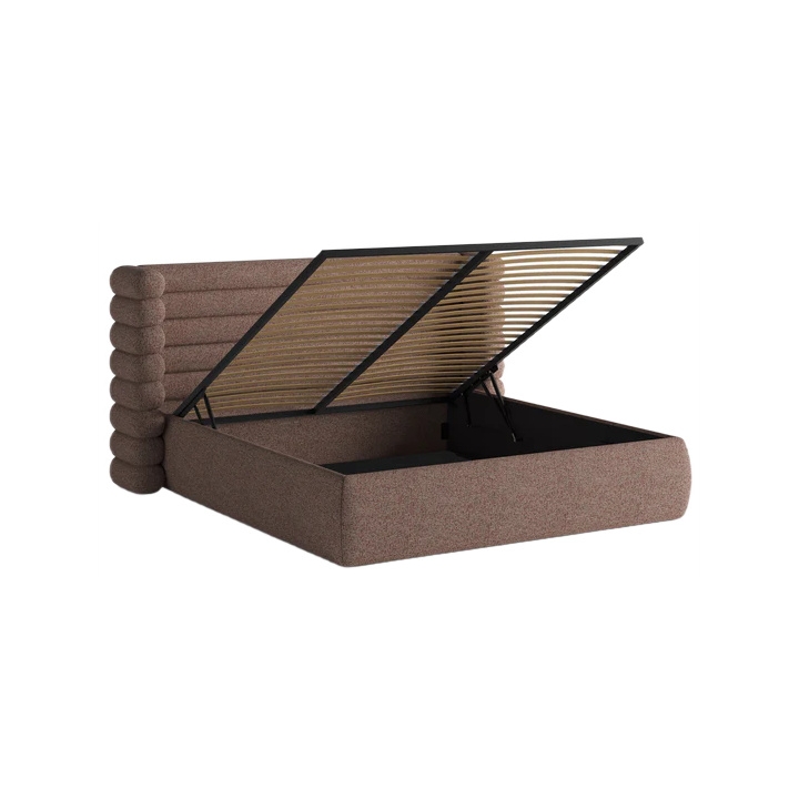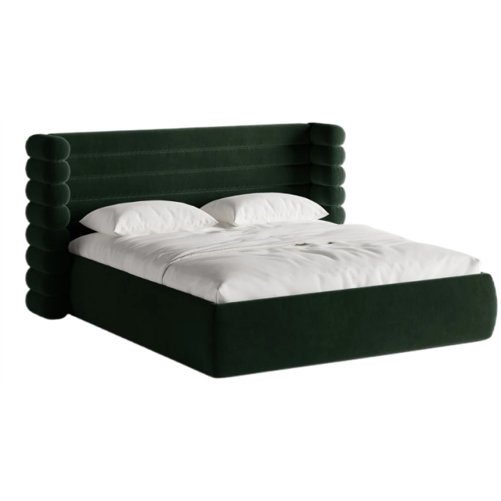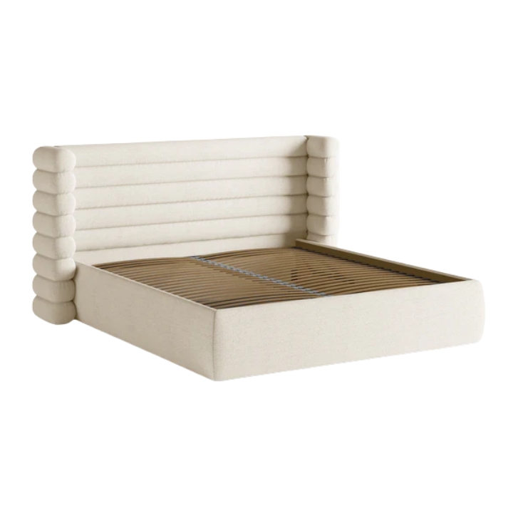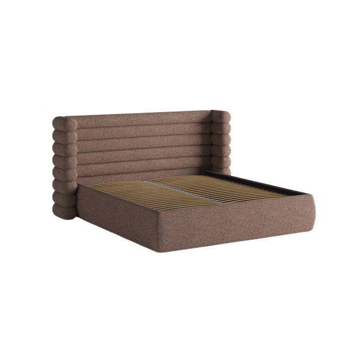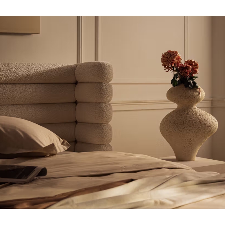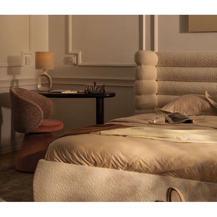 The most distinctive feature of this bed is its 120 cm high headboard. Its surface is decorated with deep horizontal panels, while the sides are enclosed by protective side panels. This headboard design creates a cozy, enclosed niche that helps separate the sleeping area from its surroundings and encourages relaxation. When upholstered in looped fabrics such as bouclé, the headboard becomes especially soft and plush.