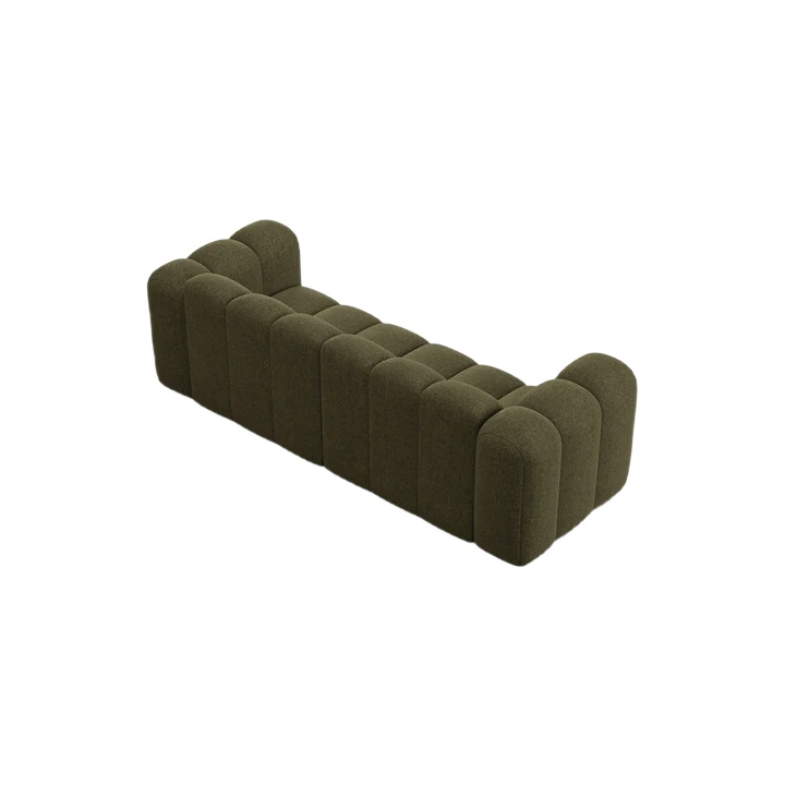 The upholstery is visually defined by distinct vertical stitching, which introduces a geometric rhythm across the entire sofa. The profiled backrest forms a continuous line with the seat and the substantial side panels. Armrests measuring 27 cm in width and 68 cm in height close the structure on both sides, acting as comfortable supports and reinforcing the sculptural form of the sofa.
