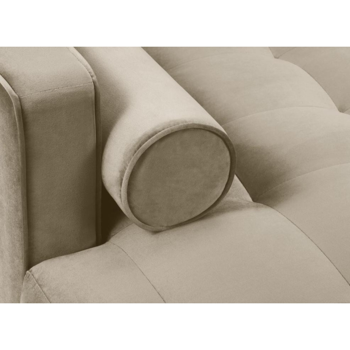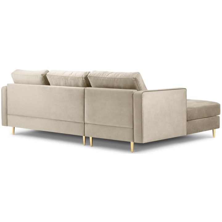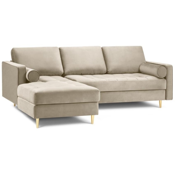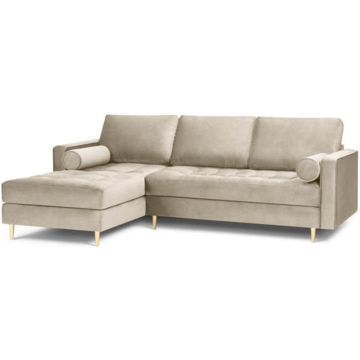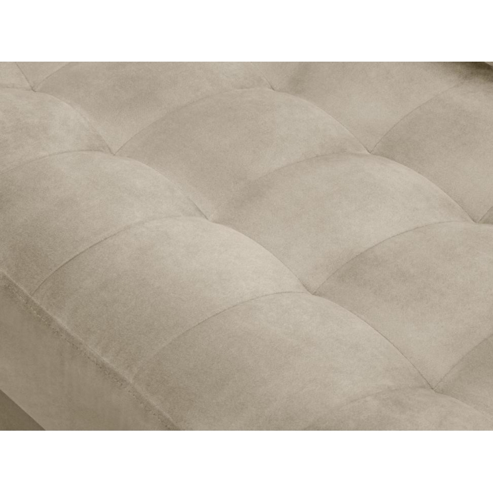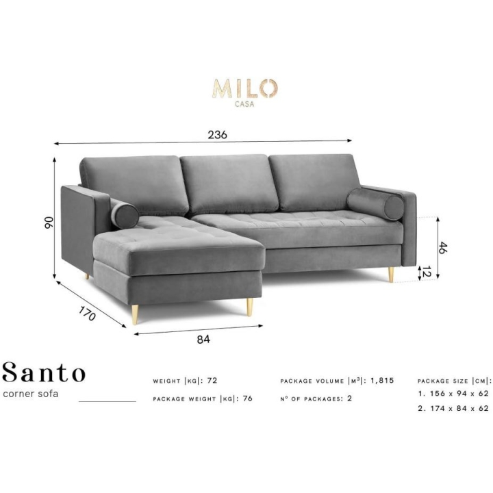 Available in 10 colours,the Santo corner sofa is an unusual option for anyone who likes to have a lot of choice. The furniture comes in Beige, Royal Blue, Grey, Dark Grey, Black, Petrol, Pink, Red, Green and Bottle Green, so it will suit any type of interior. The seat filling makes using the furniture extremely comfortable, as it is made from a combination of highly elastic polyurethane foam, springs and oatmeal, while the backrest filling is made from silicone. The velour fabric with a slightly shiny short pile is soft and pleasant to the touch, and is also extremely resistant to abrasion. The high-quality materials used in the production of the furniture ensure that the user experiences the highest level of comfort when relaxing. The furniture measures: 236 cm in width, 90 cm in height, 170 cm in depth is set on high gold metal legs that add character to the entire structure. The lounger can be produced on the left or right side, so you can better adapt the furniture to your home.