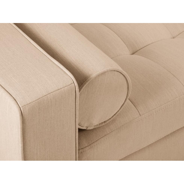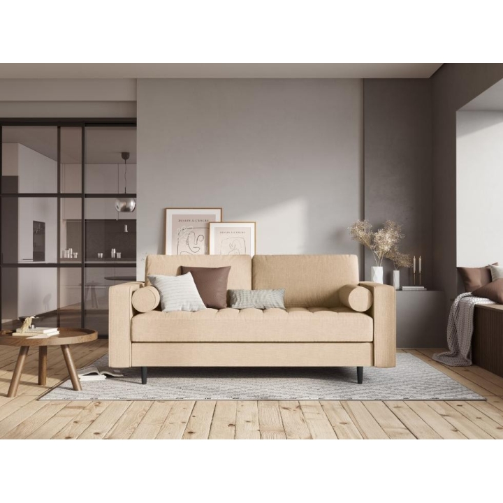 The 2-seater sofa from the Santo collection is an excellent choice for a modern living room. The seat filling is made from a combination of highly elastic polyurethane foam and oatmeal, and the backrest from silicone. The sofa is upholstered in a structured fabric that is extremely resistant to abrasion, with visible interlacing of fibres and a linen-like feel. In addition, LiquidBlocked technology is used to protect the fabric from absorbing liquids. The high quality materials used in the manufacture of the furniture ensure that the user experiences the ultimate in relaxation comfort. The furniture measures: 90 cm deep, 90 cm high, 174 cm wide is set on high wooden (beech) legs, which are a very practical solution when having a cleaning robot at home. The furniture is available in 3 colours: Beige, Light Beige and Blue. The quilted seat and elongated cushions make the sofa very comfortable.
