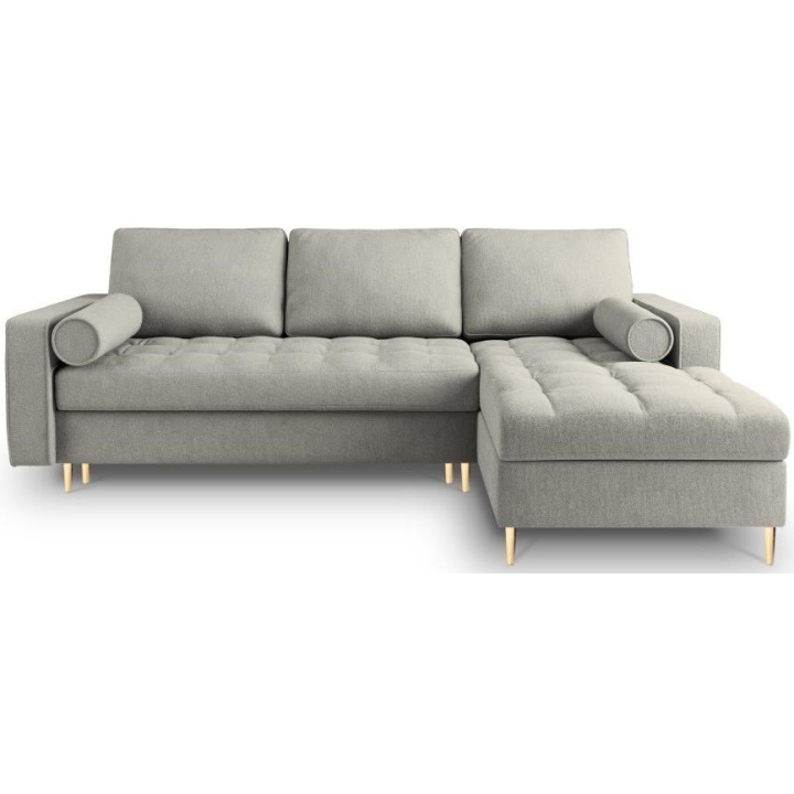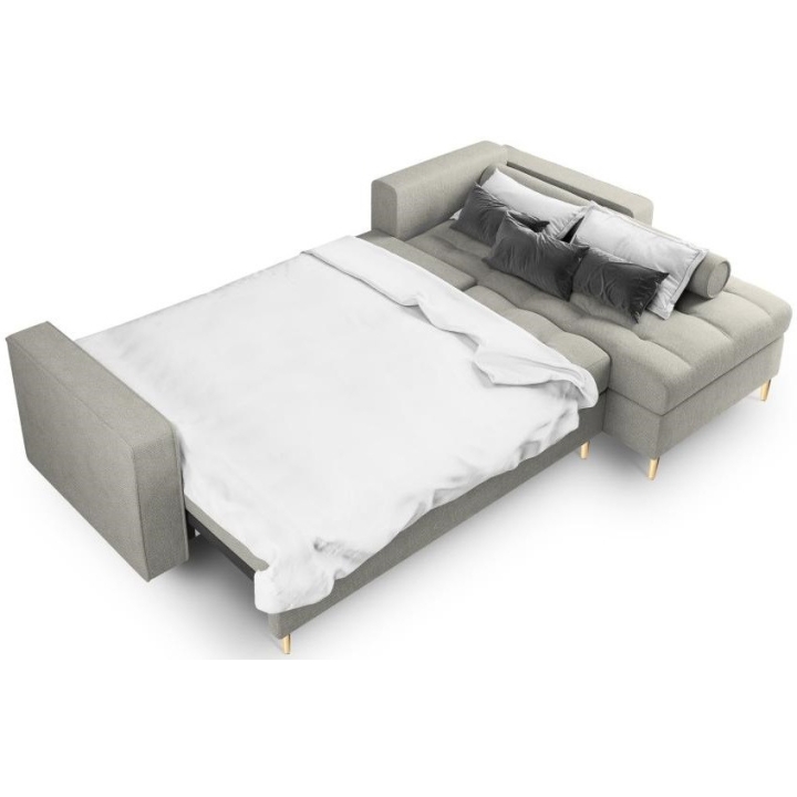 The Santo folding corner sofa from the manufacturer Milo Casa with DL sleeping function is distinguished by the seat filling, which is made from a combination of highly elastic polyurethane foam and silicone, which is also the filling of the backrest. The structured fabric with visible interlacing of fibres resembles linen to the touch and is additionally extremely resistant to abrasion. The high-quality materials used in the production of the furniture ensure that the user experiences the highest level of comfort when relaxing. The furniture measures: 240 cm wide, 96 cm high, 175 cm deep is set on high metal legs that add character to the entire structure. An aspect that will appeal to lovers of personalisation is the fact that the furniture is available in 4 colours: Beige, Light Beige, Light Grey and Dark Grey. This will ensure that the corner sofa will match any interior. The recliner can be produced on the left or right side and the size of the sleeping surface is 140 × 210 cm.
