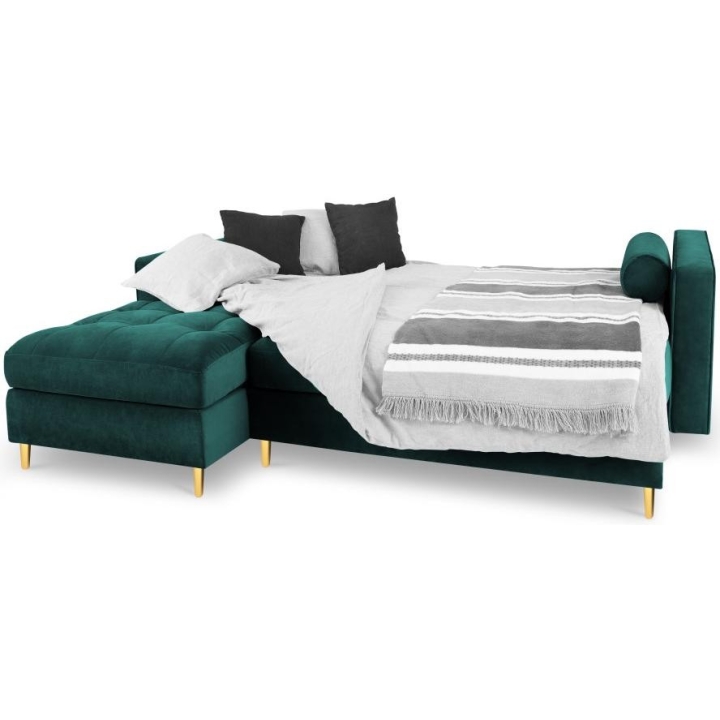 The Santo reclining corner sofa with DL sleeping function is characterised by its seat filling, which is made from a combination of highly elastic polyurethane foam and silicone, which is also the filling of the backrest. The velour fabric with LiquidBlocked technology, i.e. not absorbing liquids, is extremely resistant to abrasion and very pleasant to the touch. The high-quality materials used in the production of the furniture ensure that the user experiences the highest level of comfort when relaxing. The furniture measures: 240 cm wide, 96 cm high, 175 cm deep is set on high metal legs that add character to the entire structure. An aspect that will appeal to lovers of personalisation is the fact that the furniture is available in 8 colours: Beige, Royal Blue, Grey, Dark Grey, Black, Petrol, Red and Bottle Green. This ensures that the corner lounger will suit any living room. The lounger can be installed either on the left or right side. The size of the sleeping surface is 140 × 210 cm.