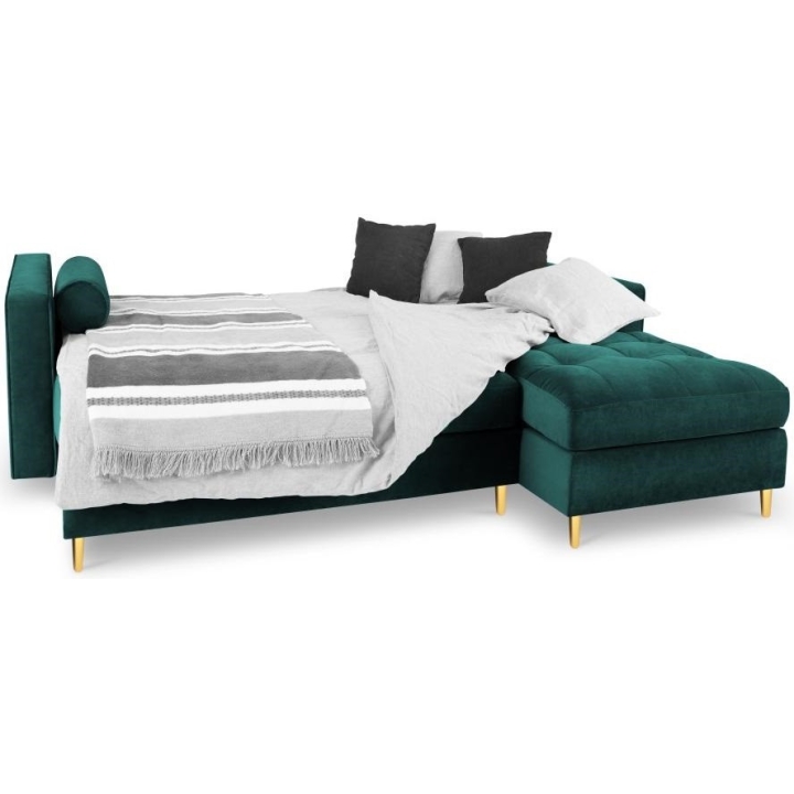 The Santo reclining corner sofa with DL sleeping function is characterised by its seat filling, which is made from a combination of highly elastic polyurethane foam and silicone, which is also the filling of the backrest. The velour fabric with LiquidBlocked technology, i.e. not absorbing liquids, is extremely resistant to abrasion and very pleasant to the touch. The high-quality materials used in the production of the furniture ensure that the user experiences the highest level of comfort when relaxing. The furniture measures: 240 cm wide, 96 cm high, 175 cm deep is set on high metal legs that add character to the entire structure. An aspect that will appeal to lovers of personalisation is the fact that the furniture is available in 8 colours: Beige, Royal Blue, Grey, Dark Grey, Black, Petrol, Red and Bottle Green. This ensures that the corner lounger will suit any living room. The lounger can be installed either on the left or right side. The size of the sleeping surface is 140 × 210 cm.