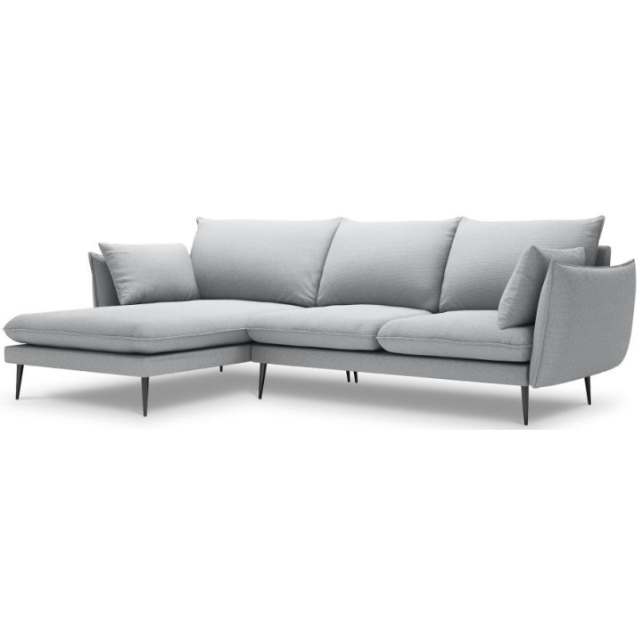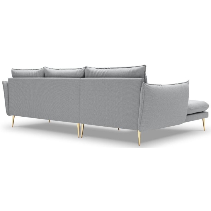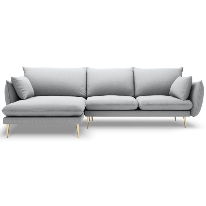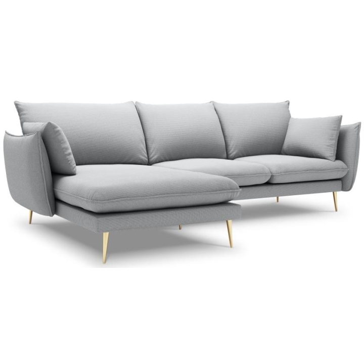 The 5-person corner sofa. Elio by manufacturer Milo Casa is a piece of furniture with dimensions: 251 cm wide, 97 cm high, 170 cm deep, which is characterised by its extreme comfort. The corner sofa is available in 9 colours: Beige, Blue, Grey, Light Grey, Dark Grey, Mint, Gold and Green, so it will suit any type of interior. The seat filling is made of springs, as well as a combination of high elasticity polyurethane foam and oatmeal just like the back filling. The furniture was upholstered with premium structural fabric, which ensures the highest comfort of relaxation and is also extremely resistant to abrasion. The high-quality materials used in the production of the furniture make the corner sofa characterised by high strength and durability. The furniture is set on high, metal legs, and their colour depends on the customer's taste (choice of gold or black). The lounger can be manufactured on the left or on the right, so you can better adapt the furniture to your flat.