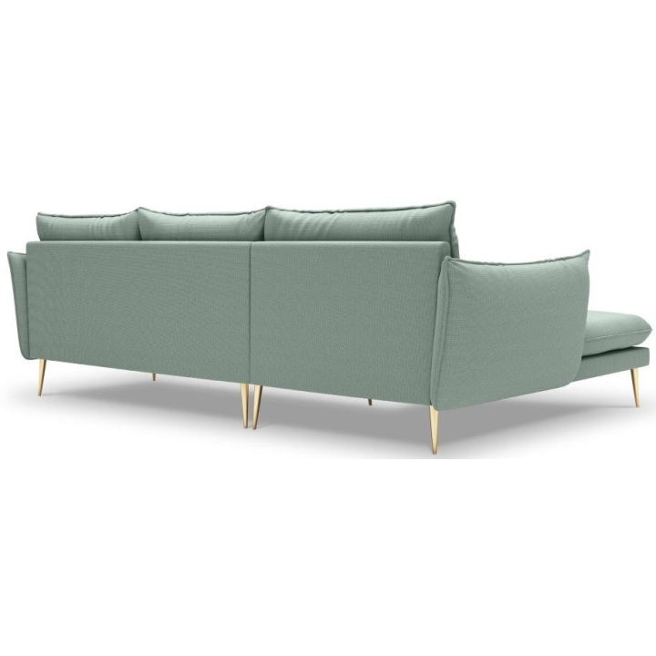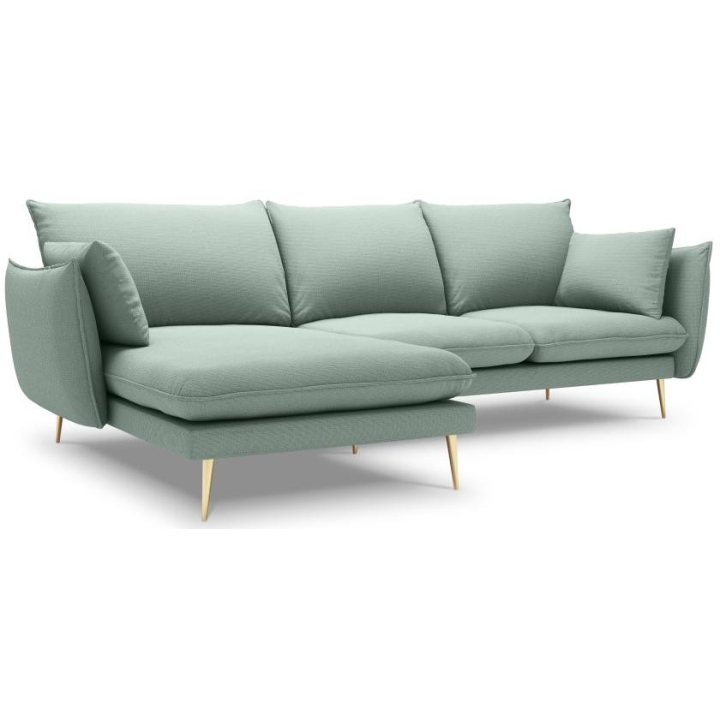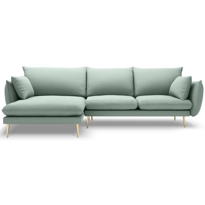 The 5-person corner sofa. Elio by manufacturer Milo Casa is a piece of furniture with dimensions: 251 cm wide, 97 cm high, 170 cm deep, which is characterised by its extreme comfort. The corner sofa is available in 9 colours: Beige, Blue, Grey, Light Grey, Dark Grey, Mint, Gold and Green, so it will suit any type of interior. The seat filling is made of springs, as well as a combination of high elasticity polyurethane foam and oatmeal just like the back filling. The furniture was upholstered with premium structural fabric, which ensures the highest comfort of relaxation and is also extremely resistant to abrasion. The high-quality materials used in the production of the furniture make the corner sofa characterised by high strength and durability. The furniture is set on high, metal legs, and their colour depends on the customer's taste (choice of gold or black). The lounger can be manufactured on the left or on the right, so you can better adapt the furniture to your flat.