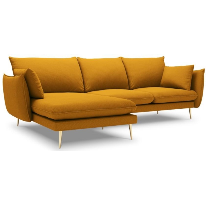 The 5-person corner sofa. Elio by manufacturer Milo Casa is a piece of furniture with dimensions: 251 cm wide, 97 cm high, 170 cm deep, which is characterised by its extreme comfort. The corner sofa is available in 9 colours: Beige, Blue, Grey, Light Grey, Dark Grey, Mint, Gold and Green, so it will suit any type of interior. The seat filling is made of springs, as well as a combination of high elasticity polyurethane foam and oatmeal just like the back filling. The furniture was upholstered with premium structural fabric, which ensures the highest comfort of relaxation and is also extremely resistant to abrasion. The high-quality materials used in the production of the furniture make the corner sofa characterised by high strength and durability. The furniture is set on high, metal legs, and their colour depends on the customer's taste (choice of gold or black). The lounger can be manufactured on the left or on the right, so you can better adapt the furniture to your flat.