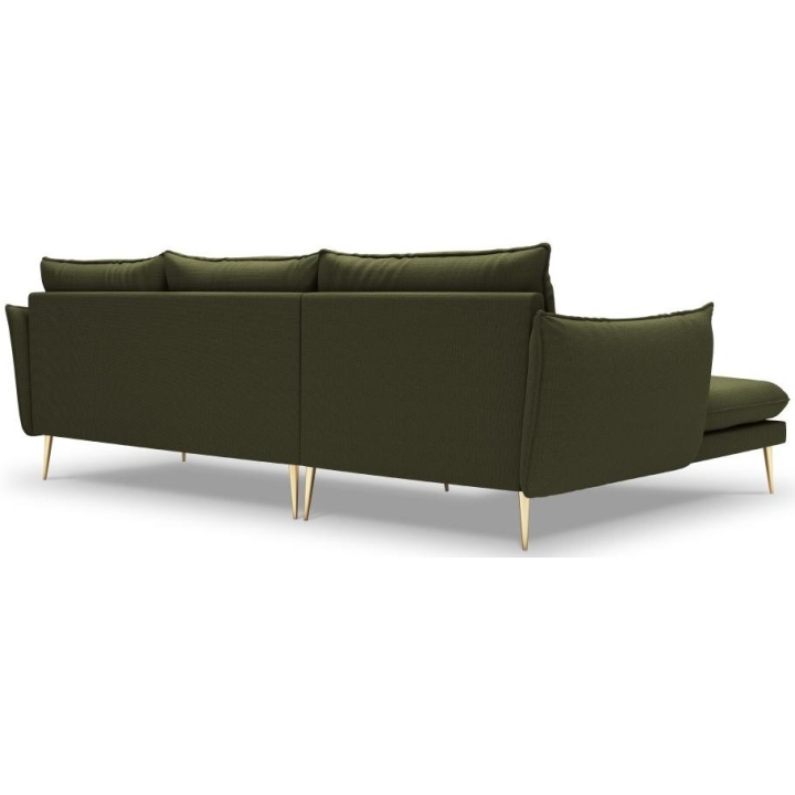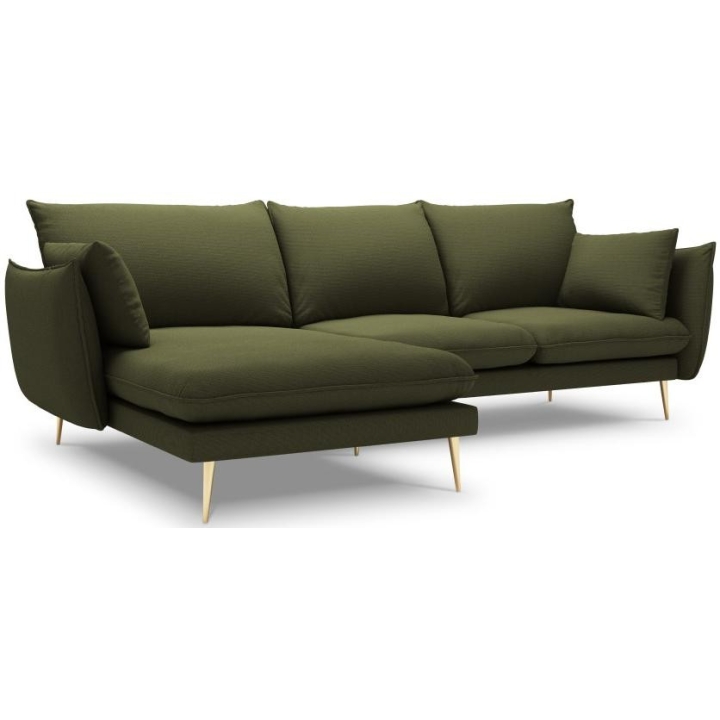 The 5-person corner sofa. Elio by manufacturer Milo Casa is a piece of furniture with dimensions: 251 cm wide, 97 cm high, 170 cm deep, which is characterised by its extreme comfort. The corner sofa is available in 9 colours: Beige, Blue, Grey, Light Grey, Dark Grey, Mint, Gold and Green, so it will suit any type of interior. The seat filling is made of springs, as well as a combination of high elasticity polyurethane foam and oatmeal just like the back filling. The furniture was upholstered with premium structural fabric, which ensures the highest comfort of relaxation and is also extremely resistant to abrasion. The high-quality materials used in the production of the furniture make the corner sofa characterised by high strength and durability. The furniture is set on high, metal legs, and their colour depends on the customer's taste (choice of gold or black). The lounger can be manufactured on the left or on the right, so you can better adapt the furniture to your flat.