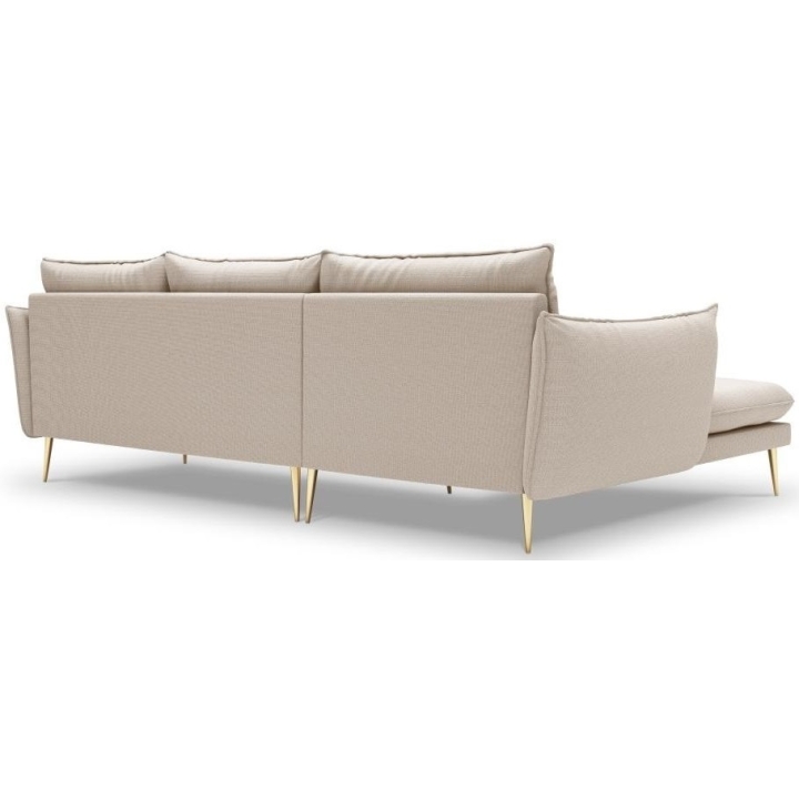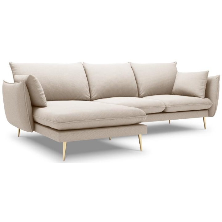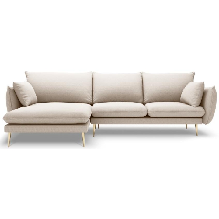 The 5-person corner sofa. Elio by manufacturer Milo Casa is a piece of furniture with dimensions: 251 cm wide, 97 cm high, 170 cm deep, which is characterised by its extreme comfort. The corner sofa is available in 9 colours: Beige, Blue, Grey, Light Grey, Dark Grey, Mint, Gold and Green, so it will suit any type of interior. The seat filling is made of springs, as well as a combination of high elasticity polyurethane foam and oatmeal just like the back filling. The furniture was upholstered with premium structural fabric, which ensures the highest comfort of relaxation and is also extremely resistant to abrasion. The high-quality materials used in the production of the furniture make the corner sofa characterised by high strength and durability. The furniture is set on high, metal legs, and their colour depends on the customer's taste (choice of gold or black). The lounger can be manufactured on the left or on the right, so you can better adapt the furniture to your flat.