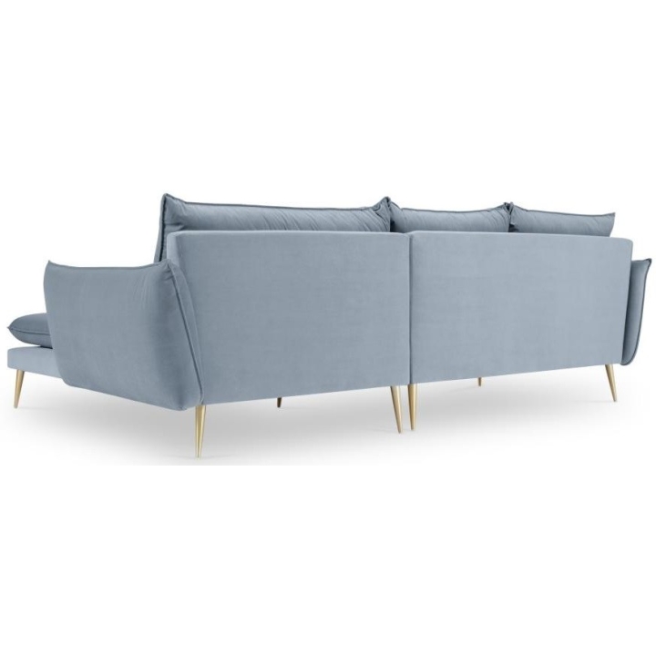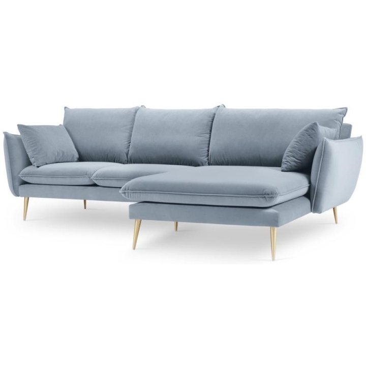 The 5-person corner sofa. Elio by manufacturer Milo Casa is a piece of furniture with dimensions: 251 cm wide, 95 cm high, 170 cm deep, which is characterised by its extreme comfort. The corner sofa is available in 8 colours: Light Beige, Light Blue, Dark Blue, Royal Blue, Light Grey, Dark Grey, Black and Bottle Green, so it will suit any type of interior. The seat filling is made from a combination of highly elastic polyurethane foam and oatmeal just like the back filling. The furniture was upholstered with velvet, which ensures the highest comfort of rest, and is also extremely resistant to abrasion. The high quality materials used in the production of the furniture make the corner sofa characterised by great strength and durability. The furniture is set on high, metal legs, and their colour depends on the customer's taste (choice of gold or black). The lounger can be manufactured on the left or right side, so you can better adapt the furniture to your home