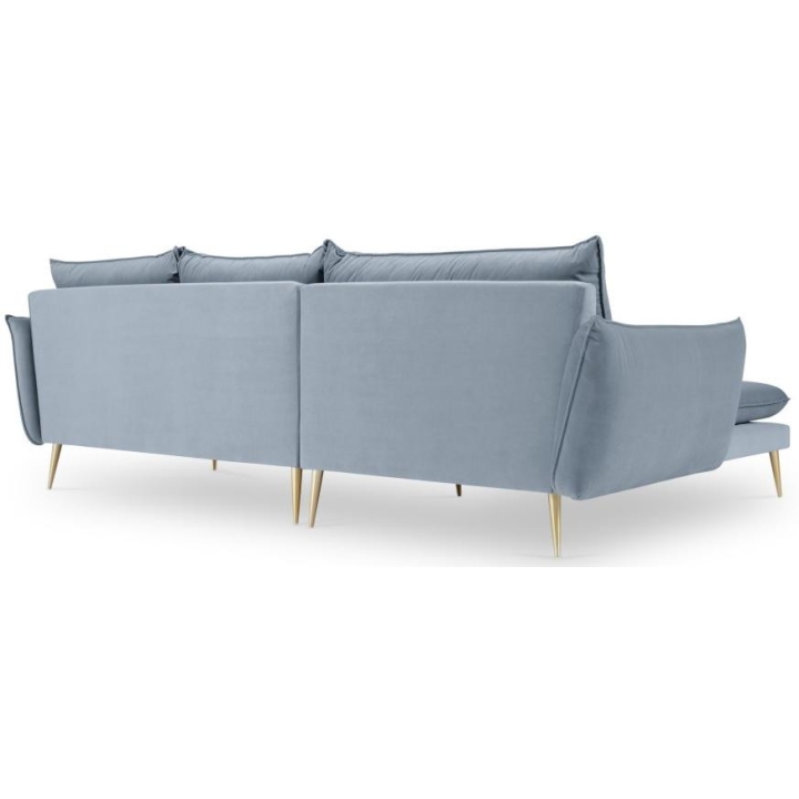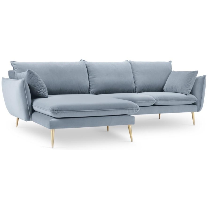 The 5-person corner sofa. Elio by manufacturer Milo Casa is a piece of furniture with dimensions: 251 cm wide, 95 cm high, 170 cm deep, which is characterised by its extreme comfort. The corner sofa is available in 8 colours: Light Beige, Light Blue, Dark Blue, Royal Blue, Light Grey, Dark Grey, Black and Bottle Green, so it will suit any type of interior. The seat filling is made from a combination of highly elastic polyurethane foam and oatmeal just like the back filling. The furniture was upholstered with velvet, which ensures the highest comfort of rest, and is also extremely resistant to abrasion. The high quality materials used in the production of the furniture make the corner sofa characterised by great strength and durability. The furniture is set on high, metal legs, and their colour depends on the customer's taste (choice of gold or black). The lounger can be manufactured on the left or right side, so you can better adapt the furniture to your home