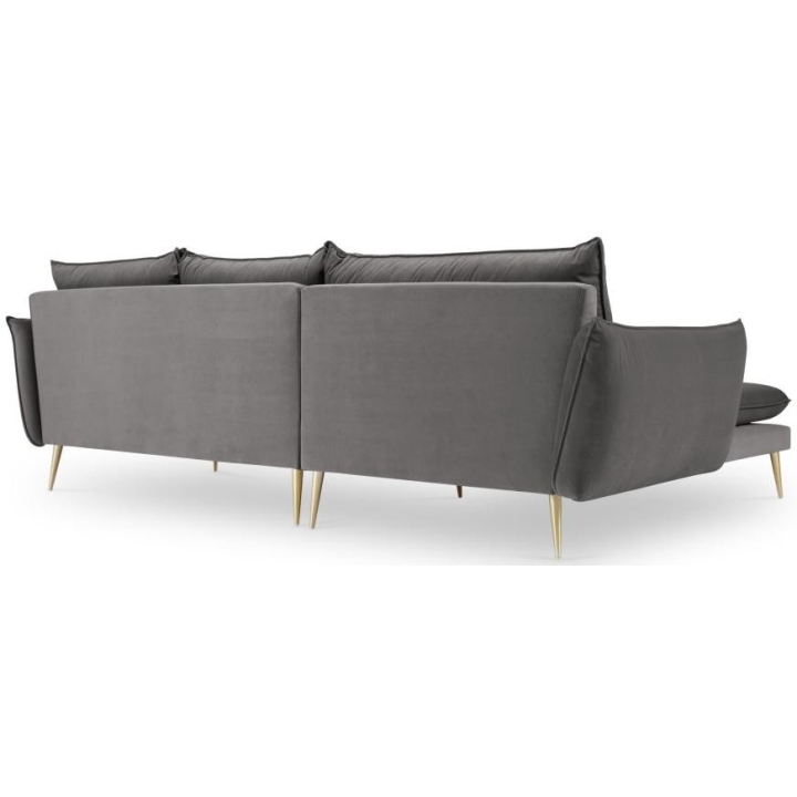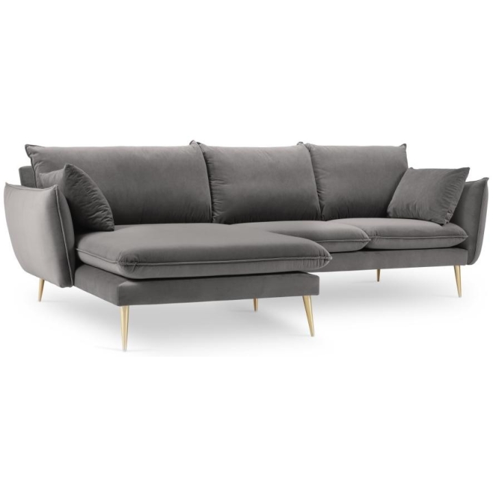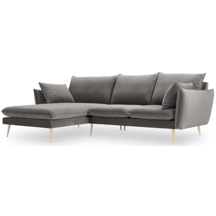 The 5-person corner sofa. Elio by manufacturer Milo Casa is a piece of furniture with dimensions: 251 cm wide, 95 cm high, 170 cm deep, which is characterised by its extreme comfort. The corner sofa is available in 8 colours: Light Beige, Light Blue, Dark Blue, Royal Blue, Light Grey, Dark Grey, Black and Bottle Green, so it will suit any type of interior. The seat filling is made from a combination of highly elastic polyurethane foam and oatmeal just like the back filling. The furniture was upholstered with velvet, which ensures the highest comfort of rest, and is also extremely resistant to abrasion. The high quality materials used in the production of the furniture make the corner sofa characterised by great strength and durability. The furniture is set on high, metal legs, and their colour depends on the customer's taste (choice of gold or black). The lounger can be manufactured on the left or right side, so you can better adapt the furniture to your home
