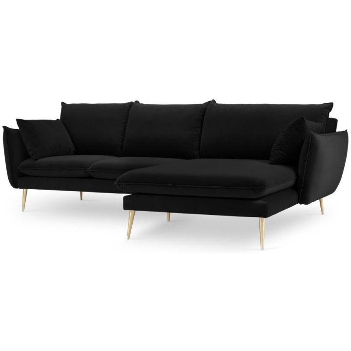 The 5-person corner sofa. Elio by manufacturer Milo Casa is a piece of furniture with dimensions: 251 cm wide, 95 cm high, 170 cm deep, which is characterised by its extreme comfort. The corner sofa is available in 8 colours: Light Beige, Light Blue, Dark Blue, Royal Blue, Light Grey, Dark Grey, Black and Bottle Green, so it will suit any type of interior. The seat filling is made from a combination of highly elastic polyurethane foam and oatmeal just like the back filling. The furniture was upholstered with velvet, which ensures the highest comfort of rest, and is also extremely resistant to abrasion. The high quality materials used in the production of the furniture make the corner sofa characterised by great strength and durability. The furniture is set on high, metal legs, and their colour depends on the customer's taste (choice of gold or black). The lounger can be manufactured on the left or right side, so you can better adapt the furniture to your home