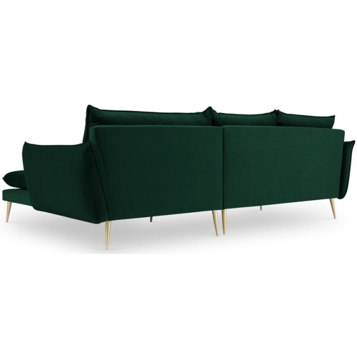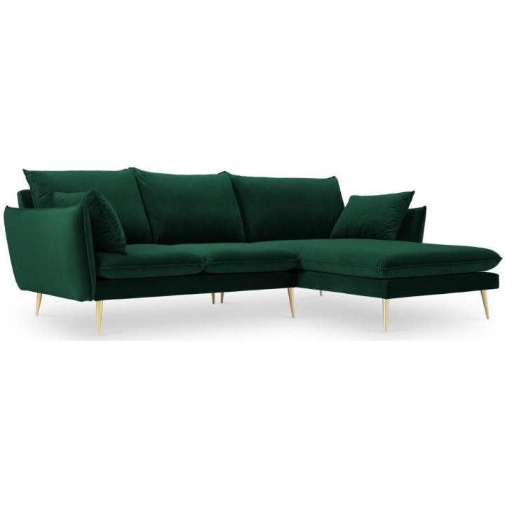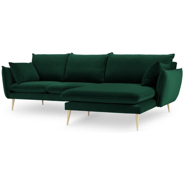 The 5-person corner sofa. Elio by manufacturer Milo Casa is a piece of furniture with dimensions: 251 cm wide, 95 cm high, 170 cm deep, which is characterised by its extreme comfort. The corner sofa is available in 8 colours: Light Beige, Light Blue, Dark Blue, Royal Blue, Light Grey, Dark Grey, Black and Bottle Green, so it will suit any type of interior. The seat filling is made from a combination of highly elastic polyurethane foam and oatmeal just like the back filling. The furniture was upholstered with velvet, which ensures the highest comfort of rest, and is also extremely resistant to abrasion. The high quality materials used in the production of the furniture make the corner sofa characterised by great strength and durability. The furniture is set on high, metal legs, and their colour depends on the customer's taste (choice of gold or black). The lounger can be manufactured on the left or right side, so you can better adapt the furniture to your home