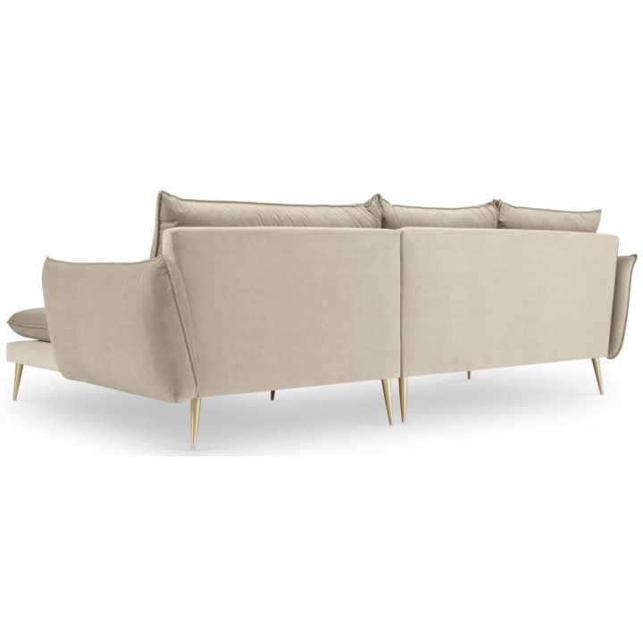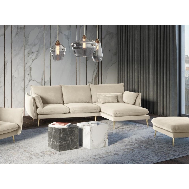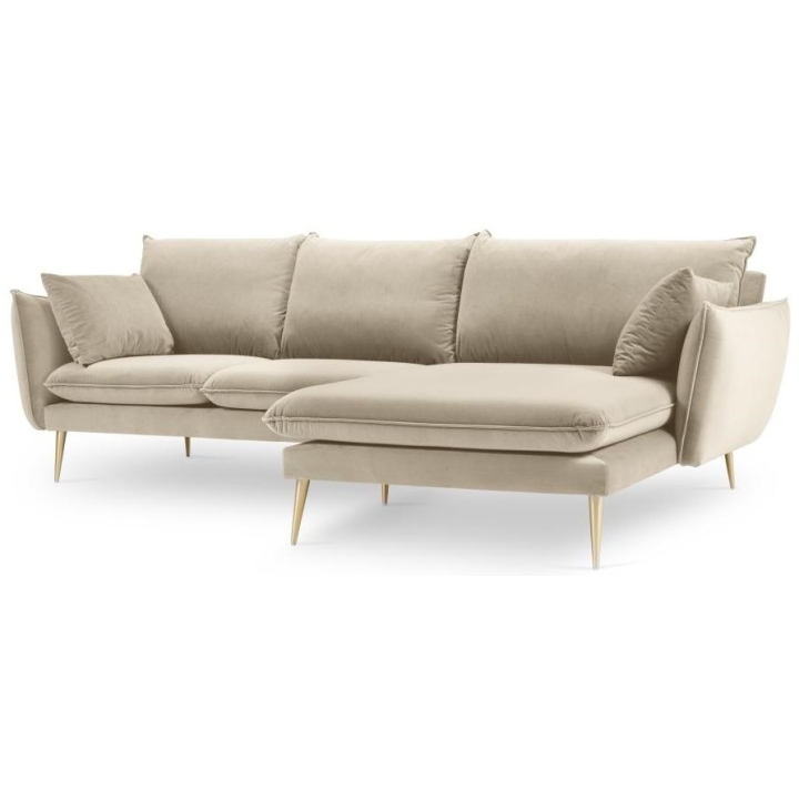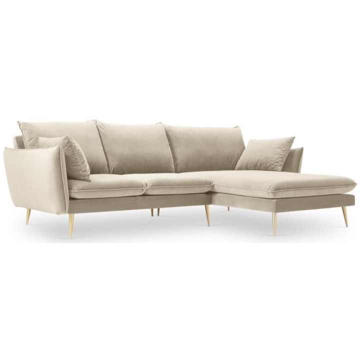 The 5-seater Elio corner sofa by Milo Casa is a piece of furniture with dimensions: 251 cm wide, 97 cm high, 170 cm deep, which is characterised by its extreme comfort. The corner sofa is available in 9 colours: Beige, Blue Grey, Dark Blue, Royal Blue, Light Grey, Black, Bottle Green, Petrol and Red, so it will suit any type of interior. The seat filling is made from a combination of highly elastic polyurethane foam and oatmeal just like the back filling. The furniture was upholstered with velvet fabric, which ensures the highest comfort of relaxation and is also extremely resistant to abrasion. The high-quality materials used in the production of the furniture make the corner sofa characterised by high strength and durability. The furniture is set on high, metal legs, and their colour depends on the customer's taste (choice of gold or black). The lounger can be manufactured on the left or on the right, so you can better adapt the furniture to your flat