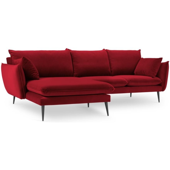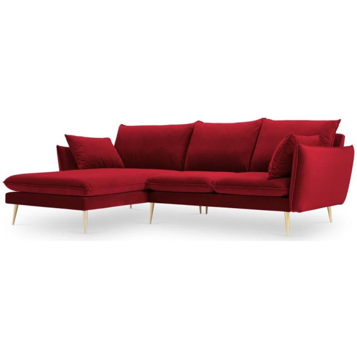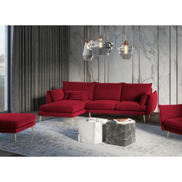 The 5-seater Elio corner sofa by Milo Casa is a piece of furniture with dimensions: 251 cm wide, 97 cm high, 170 cm deep, which is characterised by its extreme comfort. The corner sofa is available in 9 colours: Beige, Blue Grey, Dark Blue, Royal Blue, Light Grey, Black, Bottle Green, Petrol and Red, so it will suit any type of interior. The seat filling is made from a combination of highly elastic polyurethane foam and oatmeal just like the back filling. The furniture was upholstered with velvet fabric, which ensures the highest comfort of relaxation and is also extremely resistant to abrasion. The high-quality materials used in the production of the furniture make the corner sofa characterised by high strength and durability. The furniture is set on high, metal legs, and their colour depends on the customer's taste (choice of gold or black). The lounger can be manufactured on the left or on the right, so you can better adapt the furniture to your flat