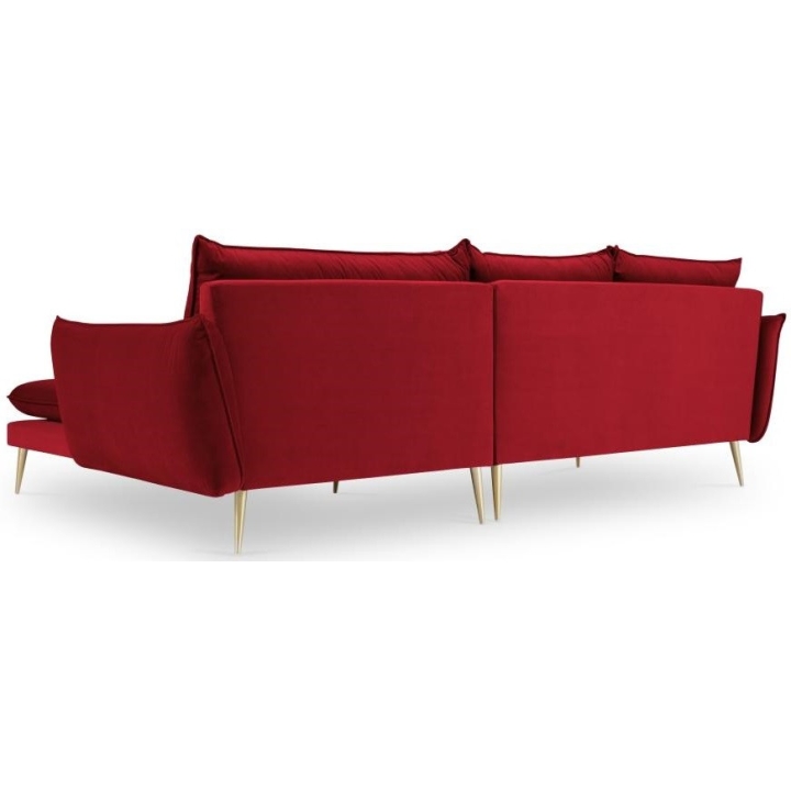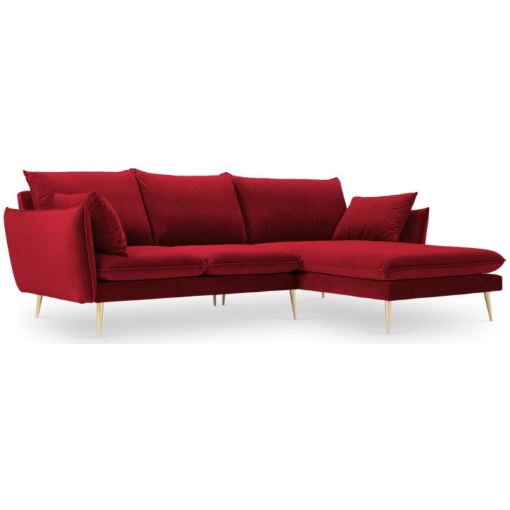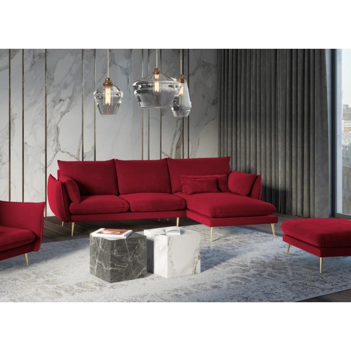 The 5-seater Elio corner sofa by Milo Casa is a piece of furniture with dimensions: 251 cm wide, 97 cm high, 170 cm deep, which is characterised by its extreme comfort. The corner sofa is available in 9 colours: Beige, Blue Grey, Dark Blue, Royal Blue, Light Grey, Black, Bottle Green, Petrol and Red, so it will suit any type of interior. The seat filling is made from a combination of highly elastic polyurethane foam and oatmeal just like the back filling. The furniture was upholstered with velvet fabric, which ensures the highest comfort of relaxation and is also extremely resistant to abrasion. The high-quality materials used in the production of the furniture make the corner sofa characterised by high strength and durability. The furniture is set on high, metal legs, and their colour depends on the customer's taste (choice of gold or black). The lounger can be manufactured on the left or on the right, so you can better adapt the furniture to your flat