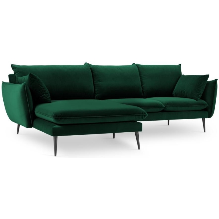 The 5-seater Elio corner sofa by Milo Casa is a piece of furniture with dimensions: 251 cm wide, 97 cm high, 170 cm deep, which is characterised by its extreme comfort. The corner sofa is available in 9 colours: Beige, Blue Grey, Dark Blue, Royal Blue, Light Grey, Black, Bottle Green, Petrol and Red, so it will suit any type of interior. The seat filling is made from a combination of highly elastic polyurethane foam and oatmeal just like the back filling. The furniture was upholstered with velvet fabric, which ensures the highest comfort of relaxation and is also extremely resistant to abrasion. The high-quality materials used in the production of the furniture make the corner sofa characterised by high strength and durability. The furniture is set on high, metal legs, and their colour depends on the customer's taste (choice of gold or black). The lounger can be manufactured on the left or on the right, so you can better adapt the furniture to your flat