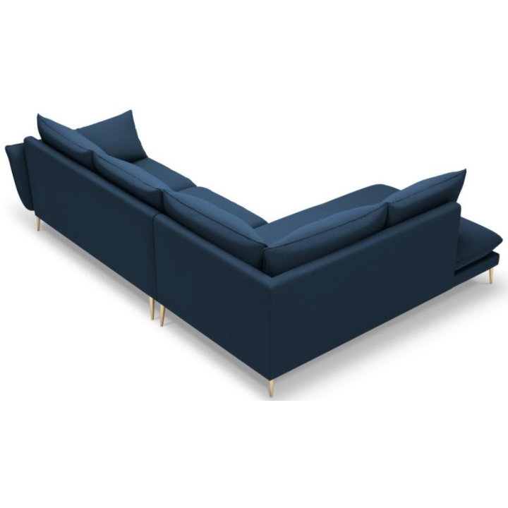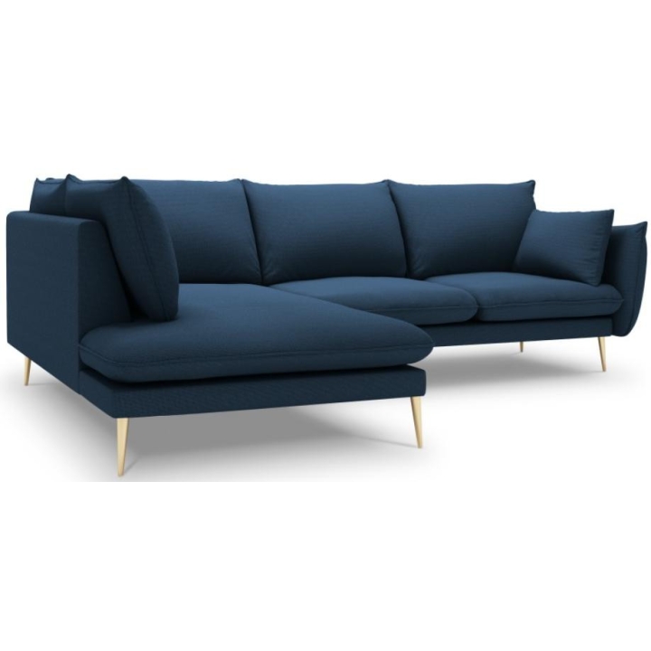 The 6-seater Elio corner sofa by manufacturer Milo Casa is a piece of furniture that measures: 251 cm wide, 95 cm high, 185 cm deep, which is characterised by its extreme comfort. The corner sofa is available in 8 colours: Beige, Blue, Grey, Light Grey, Dark Grey, Mint, Gold and Green, so it will suit any type of interior. The seat filling is made from a combination of highly elastic polyurethane foam and oatmeal, as is the backrest filling. The furniture was upholstered with a structured fabric, which resembles linen to the touch and is also extremely resistant to abrasion. The high-quality materials used in the production of the furniture ensure that the user experiences the highest level of comfort when relaxing. The furniture is set on high metal legs, and their colour depends on the customer's taste (choice of gold or black). The lounger can be manufactured on the left or right side, so you can better adapt the furniture to your home.