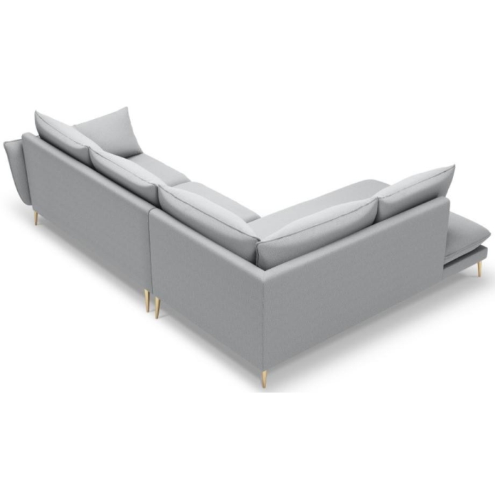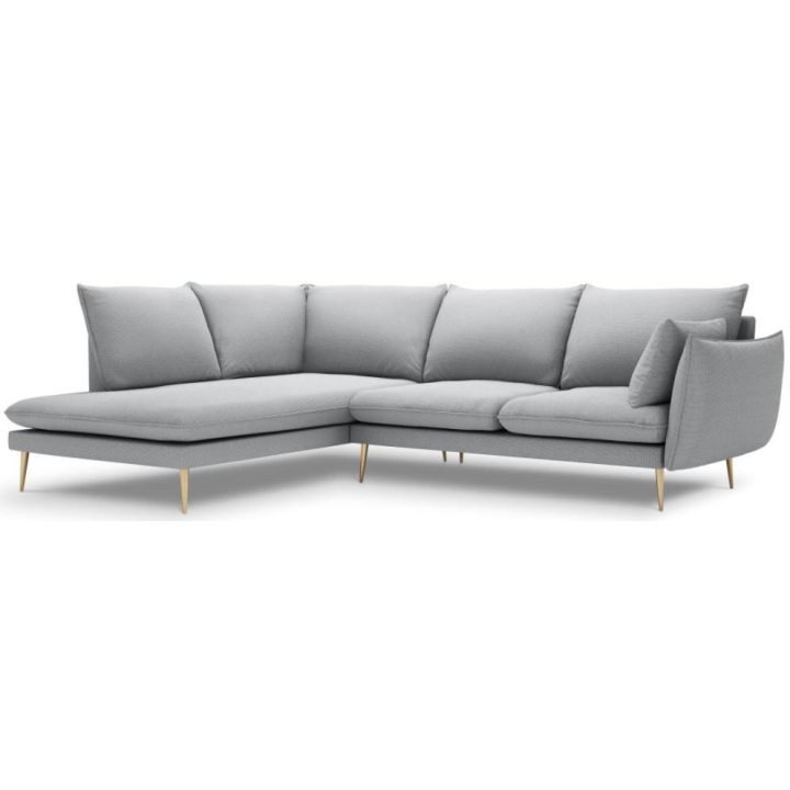 The 6-seater Elio corner sofa by manufacturer Milo Casa is a piece of furniture that measures: 251 cm wide, 95 cm high, 185 cm deep, which is characterised by its extreme comfort. The corner sofa is available in 8 colours: Beige, Blue, Grey, Light Grey, Dark Grey, Mint, Gold and Green, so it will suit any type of interior. The seat filling is made from a combination of highly elastic polyurethane foam and oatmeal, as is the backrest filling. The furniture was upholstered with a structured fabric, which resembles linen to the touch and is also extremely resistant to abrasion. The high-quality materials used in the production of the furniture ensure that the user experiences the highest level of comfort when relaxing. The furniture is set on high metal legs, and their colour depends on the customer's taste (choice of gold or black). The lounger can be manufactured on the left or right side, so you can better adapt the furniture to your home.