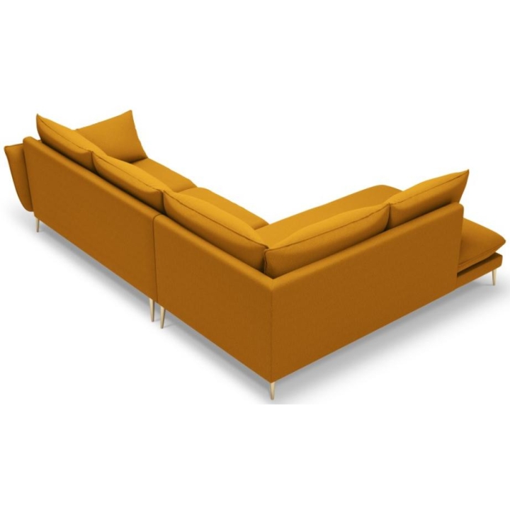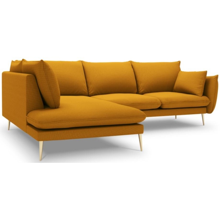 The 6-seater Elio corner sofa by manufacturer Milo Casa is a piece of furniture that measures: 251 cm wide, 95 cm high, 185 cm deep, which is characterised by its extreme comfort. The corner sofa is available in 8 colours: Beige, Blue, Grey, Light Grey, Dark Grey, Mint, Gold and Green, so it will suit any type of interior. The seat filling is made from a combination of highly elastic polyurethane foam and oatmeal, as is the backrest filling. The furniture was upholstered with a structured fabric, which resembles linen to the touch and is also extremely resistant to abrasion. The high-quality materials used in the production of the furniture ensure that the user experiences the highest level of comfort when relaxing. The furniture is set on high metal legs, and their colour depends on the customer's taste (choice of gold or black). The lounger can be manufactured on the left or right side, so you can better adapt the furniture to your home.
