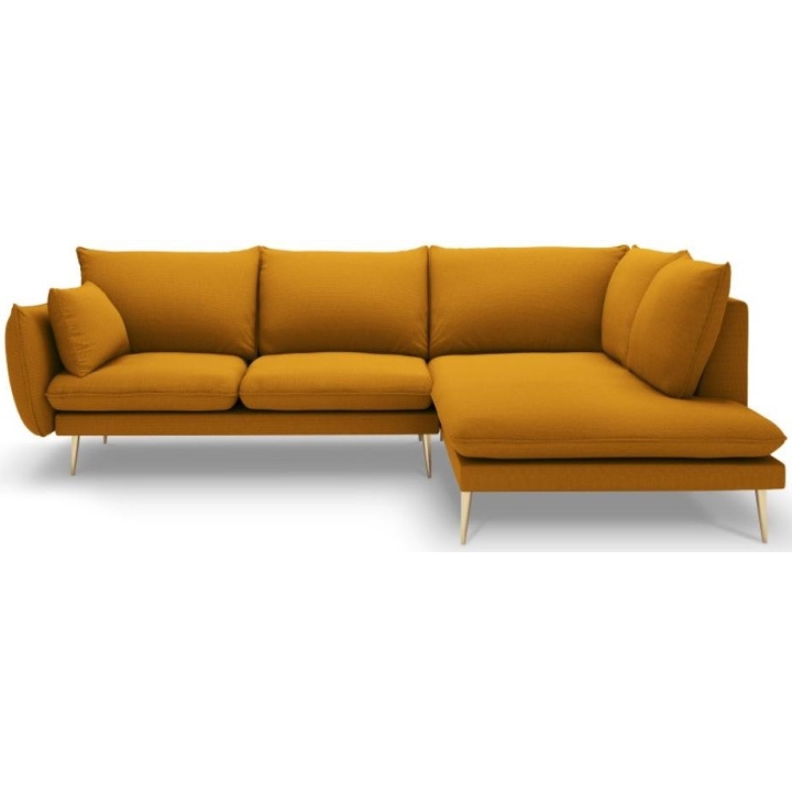 The 6-seater Elio corner sofa by manufacturer Milo Casa is a piece of furniture that measures: 251 cm wide, 95 cm high, 185 cm deep, which is characterised by its extreme comfort. The corner sofa is available in 8 colours: Beige, Blue, Grey, Light Grey, Dark Grey, Mint, Gold and Green, so it will suit any type of interior. The seat filling is made from a combination of highly elastic polyurethane foam and oatmeal, as is the backrest filling. The furniture was upholstered with a structured fabric, which resembles linen to the touch and is also extremely resistant to abrasion. The high-quality materials used in the production of the furniture ensure that the user experiences the highest level of comfort when relaxing. The furniture is set on high metal legs, and their colour depends on the customer's taste (choice of gold or black). The lounger can be manufactured on the left or right side, so you can better adapt the furniture to your home.