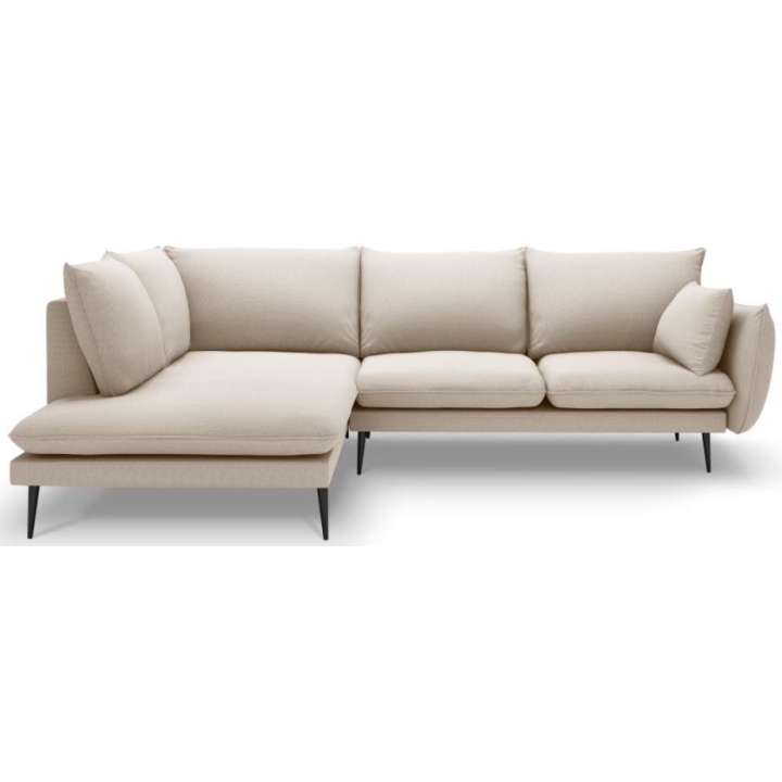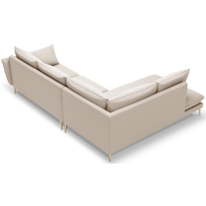 The 6-seater Elio corner sofa by manufacturer Milo Casa is a piece of furniture that measures: 251 cm wide, 95 cm high, 185 cm deep, which is characterised by its extreme comfort. The corner sofa is available in 8 colours: Beige, Blue, Grey, Light Grey, Dark Grey, Mint, Gold and Green, so it will suit any type of interior. The seat filling is made from a combination of highly elastic polyurethane foam and oatmeal, as is the backrest filling. The furniture was upholstered with a structured fabric, which resembles linen to the touch and is also extremely resistant to abrasion. The high-quality materials used in the production of the furniture ensure that the user experiences the highest level of comfort when relaxing. The furniture is set on high metal legs, and their colour depends on the customer's taste (choice of gold or black). The lounger can be manufactured on the left or right side, so you can better adapt the furniture to your home.