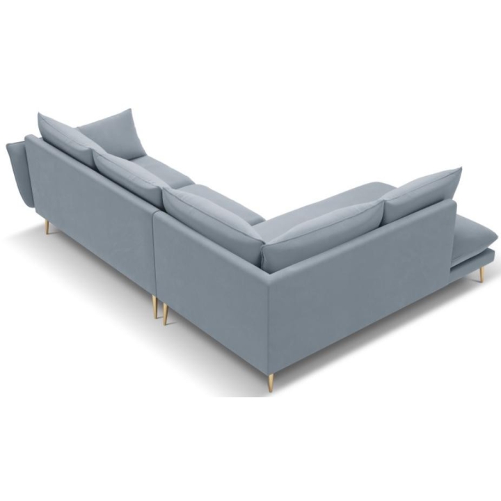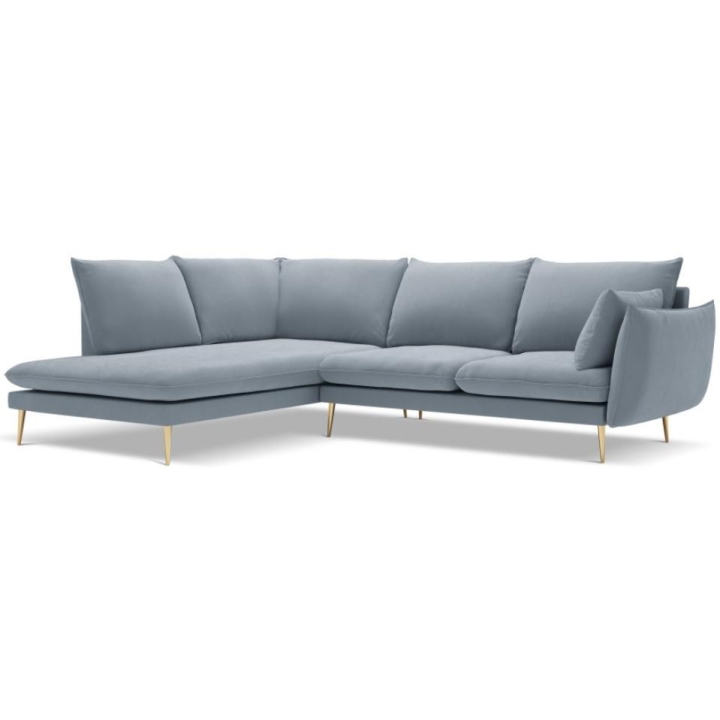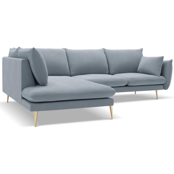 The 6-seater Elio corner sofa by manufacturer Milo Casa is a piece of furniture that measures: 251 cm wide, 95 cm high, 185 cm deep, which is characterised by its extreme comfort. The corner sofa is available in 8 colours: Light Beige, Light Blue, Dark Blue, Royal Blue, Light Grey, Dark Grey, Black and Bottle Green, so it will suit any type of interior. The seat filling is made from a combination of highly elastic polyurethane foam and oatmeal just like the back filling. The furniture was upholstered with velvet, which ensures the highest comfort of rest, and is also extremely resistant to abrasion. The high quality materials used in the production of the furniture make the corner sofa characterised by great strength and durability. The furniture is set on high, metal legs, and their colour depends on the customer's taste (choice of gold or black). The lounger can be manufactured on the left or on the right, so you can better adapt the furniture to your home.