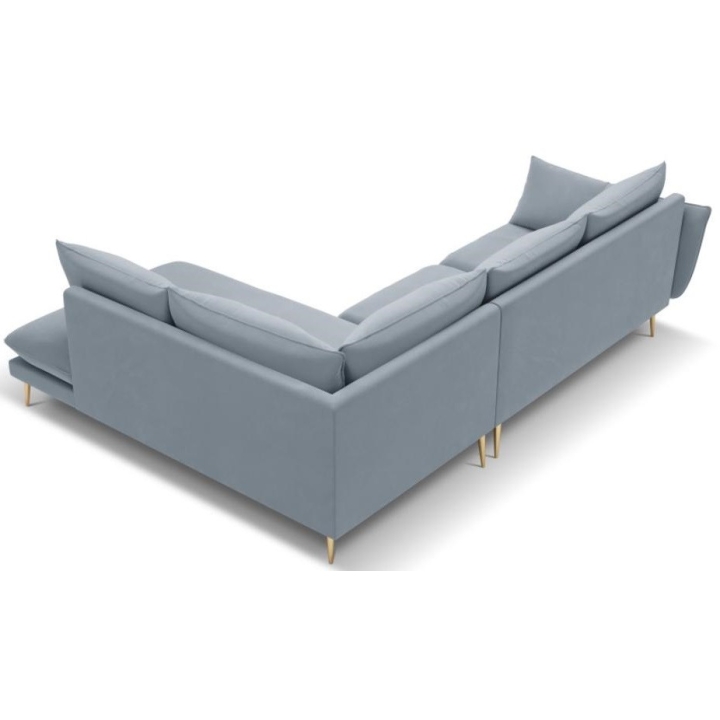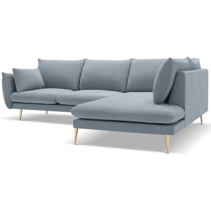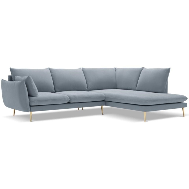 The 6-seater Elio corner sofa by manufacturer Milo Casa is a piece of furniture that measures: 251 cm wide, 95 cm high, 185 cm deep, which is characterised by its extreme comfort. The corner sofa is available in 8 colours: Light Beige, Light Blue, Dark Blue, Royal Blue, Light Grey, Dark Grey, Black and Bottle Green, so it will suit any type of interior. The seat filling is made from a combination of highly elastic polyurethane foam and oatmeal just like the back filling. The furniture was upholstered with velvet, which ensures the highest comfort of rest, and is also extremely resistant to abrasion. The high quality materials used in the production of the furniture make the corner sofa characterised by great strength and durability. The furniture is set on high, metal legs, and their colour depends on the customer's taste (choice of gold or black). The lounger can be manufactured on the left or on the right, so you can better adapt the furniture to your home.