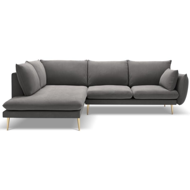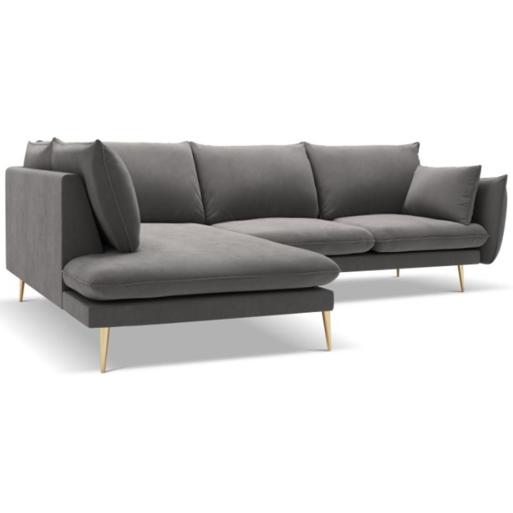 The 6-seater Elio corner sofa by manufacturer Milo Casa is a piece of furniture that measures: 251 cm wide, 95 cm high, 185 cm deep, which is characterised by its extreme comfort. The corner sofa is available in 8 colours: Light Beige, Light Blue, Dark Blue, Royal Blue, Light Grey, Dark Grey, Black and Bottle Green, so it will suit any type of interior. The seat filling is made from a combination of highly elastic polyurethane foam and oatmeal just like the back filling. The furniture was upholstered with velvet, which ensures the highest comfort of rest, and is also extremely resistant to abrasion. The high quality materials used in the production of the furniture make the corner sofa characterised by great strength and durability. The furniture is set on high, metal legs, and their colour depends on the customer's taste (choice of gold or black). The lounger can be manufactured on the left or on the right, so you can better adapt the furniture to your home.