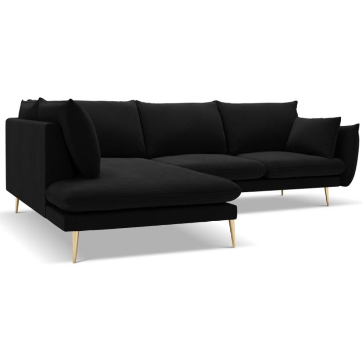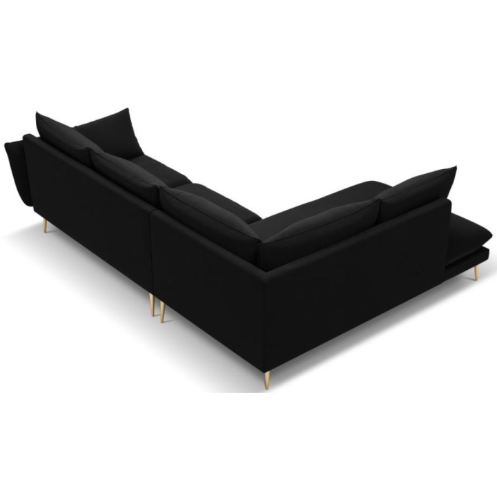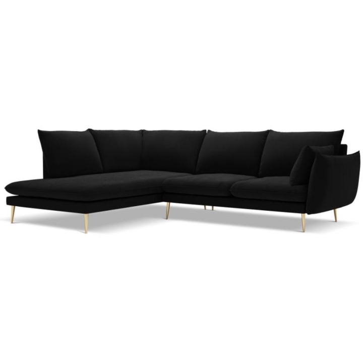 The 6-seater Elio corner sofa by manufacturer Milo Casa is a piece of furniture that measures: 251 cm wide, 95 cm high, 185 cm deep, which is characterised by its extreme comfort. The corner sofa is available in 8 colours: Light Beige, Light Blue, Dark Blue, Royal Blue, Light Grey, Dark Grey, Black and Bottle Green, so it will suit any type of interior. The seat filling is made from a combination of highly elastic polyurethane foam and oatmeal just like the back filling. The furniture was upholstered with velvet, which ensures the highest comfort of rest, and is also extremely resistant to abrasion. The high quality materials used in the production of the furniture make the corner sofa characterised by great strength and durability. The furniture is set on high, metal legs, and their colour depends on the customer's taste (choice of gold or black). The lounger can be manufactured on the left or on the right, so you can better adapt the furniture to your home.