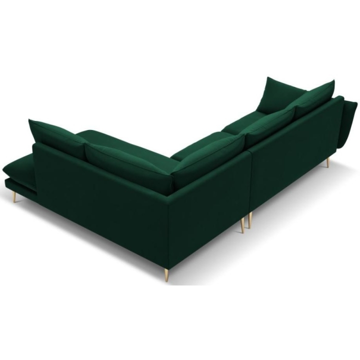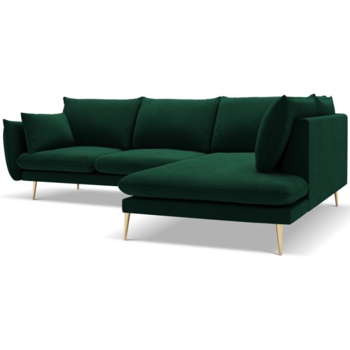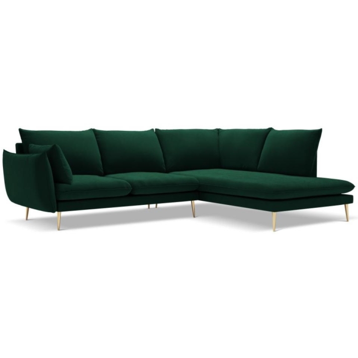 The 6-seater Elio corner sofa by manufacturer Milo Casa is a piece of furniture that measures: 251 cm wide, 95 cm high, 185 cm deep, which is characterised by its extreme comfort. The corner sofa is available in 8 colours: Light Beige, Light Blue, Dark Blue, Royal Blue, Light Grey, Dark Grey, Black and Bottle Green, so it will suit any type of interior. The seat filling is made from a combination of highly elastic polyurethane foam and oatmeal just like the back filling. The furniture was upholstered with velvet, which ensures the highest comfort of rest, and is also extremely resistant to abrasion. The high quality materials used in the production of the furniture make the corner sofa characterised by great strength and durability. The furniture is set on high, metal legs, and their colour depends on the customer's taste (choice of gold or black). The lounger can be manufactured on the left or on the right, so you can better adapt the furniture to your home.