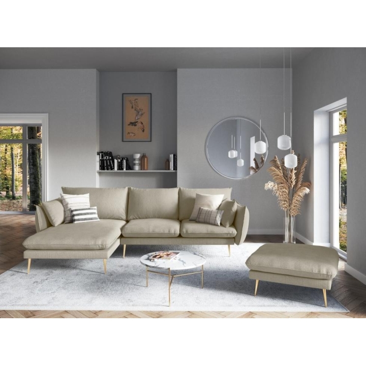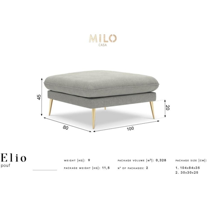The pouffe from the Elio collection by manufacturer Milo Casa is a piece of furniture that suits any style of interior. The seat filling is made from a combination of polyurethane foam with high elasticity and oat. The pouffe is upholstered with a structured fabric, which is characterised by high durability and is available in the colours beige, dark grey, light beige and light grey. The highest quality materials have been used in the production of the pouffe in the interest of the highest comfort of the users. The piece of furniture measures: 100 cm in length, 45 cm in height and 80 cm in width is set on high metal (gold or black) legs. The high legs are a very practical solution when having a cleaning robot in the house. The smooth seat makes the pouffe very comfortable and can be used as a seat as well as a footstool.