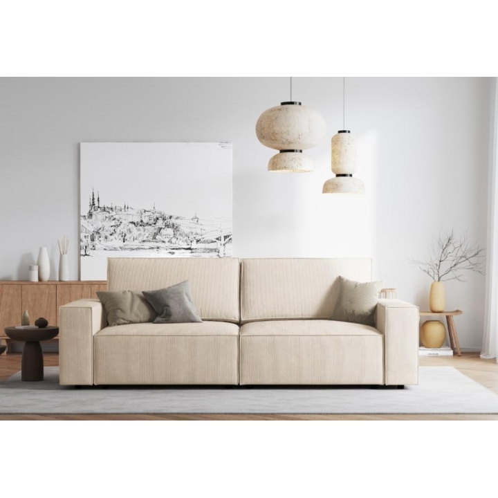 The small 3-seater sofa Carlo by the manufacturer Milo Casa is a piece of furniture with dimensions: 206 cm wide, 90 cm high, 102 cm deep, which is characterised by its extreme comfort. This trendy sofa is available in 8 colours: Beige, Light Blue, Dark Blue, Grey, Light Grey, Yellow, Black and Bottle Green, so it will suit any type of interior. The seat filling is made from a combination of corrugated spring and high elasticity polyurethane foam, and the backrest is filled with silicone. A distinctive feature of the sofa is its small size. The sofa is upholstered with corduroy matte fabric, pleasant to the touch, which ensures the highest comfort of rest and is resistant to abrasion. The high quality materials used in the production of the furniture make the three-seater sofa Carlo characterised by high strength and durability. The furniture is set on low, plastic legs.