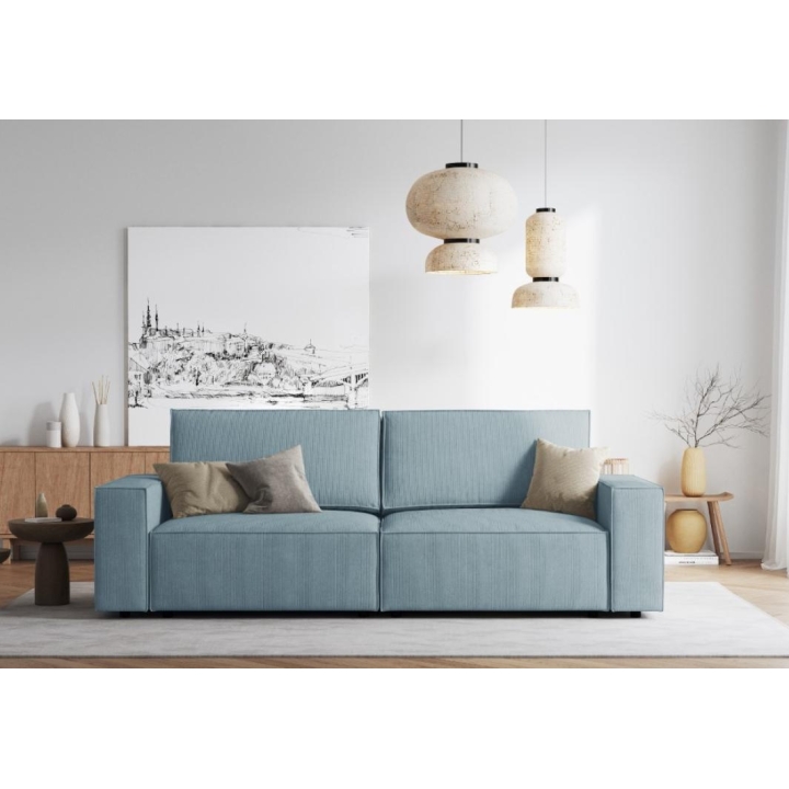 The small 3-seater sofa Carlo by the manufacturer Milo Casa is a piece of furniture with dimensions: 206 cm wide, 90 cm high, 102 cm deep, which is characterised by its extreme comfort. This trendy sofa is available in 8 colours: Beige, Light Blue, Dark Blue, Grey, Light Grey, Yellow, Black and Bottle Green, so it will suit any type of interior. The seat filling is made from a combination of corrugated spring and high elasticity polyurethane foam, and the backrest is filled with silicone. A distinctive feature of the sofa is its small size. The sofa is upholstered with corduroy matte fabric, pleasant to the touch, which ensures the highest comfort of rest and is resistant to abrasion. The high quality materials used in the production of the furniture make the three-seater sofa Carlo characterised by high strength and durability. The furniture is set on low, plastic legs.