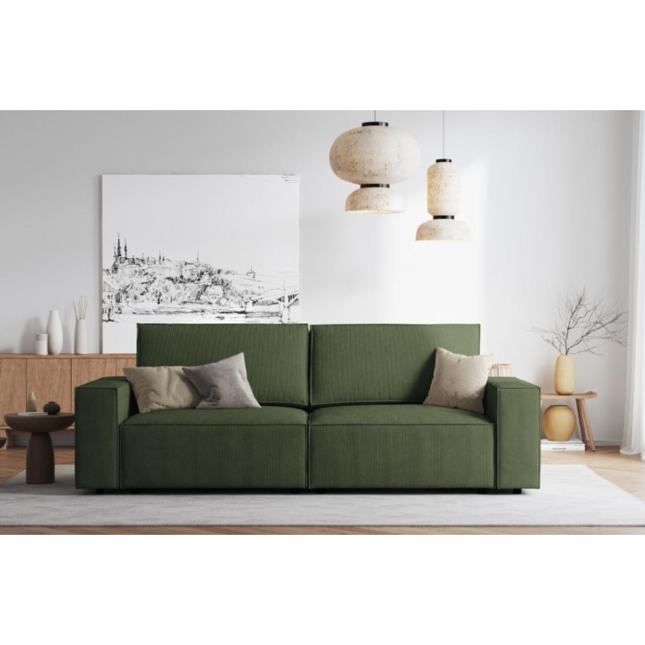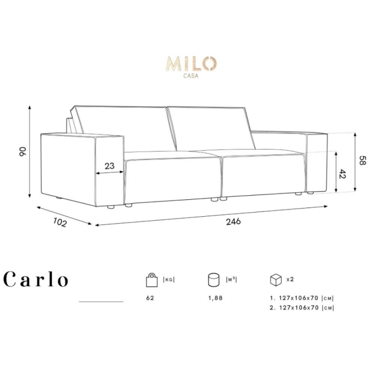 The elegant Carlo 4-seater sofa by the manufacturer Milo Casais a piece of furniture that measures: 246 cm wide, 90 cm high, 102 cm deep, which is characterised by its extreme comfort. This fashionable sofa is available in 8 colours: Beige, Light Blue, Dark Blue, Grey, Light Grey, Yellow, Black and Bottle Green, so it will suit any type of interior. The seat filling is made from a combination of corrugated spring and high elasticity polyurethane foam, and the backrest is filled with silicone. A distinctive feature of the sofa is its standard dimensions, which contribute to the high comfort of use. The sofa has been upholstered with a matte corduroy fabric, which is resistant to abrasion and pleasant to the touch. The high-quality materials used in the production of the furniture make the Carlo four-seater sofa characterised by high strength and durability. The furniture is set on low, plastic legs.