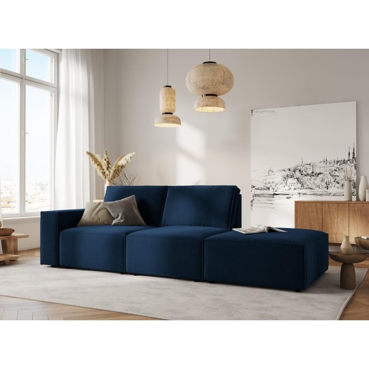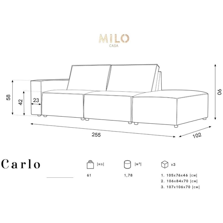 The Carlo 3-seater sofa from the Milo Casa manufacturer is a piece of furniture with dimensions: 255 cm wide, 90 cm high, 102 cm deep, which is characterised by its extreme comfort. This fashionable sofa is available in 7 colours: Light Beige, Royal Blue, Grey, Light Grey, Yellow, Black and Bottle Green, so it will suit any type of interior. The seat filling is made from a combination of corrugated spring and high elasticity polyurethane foam, while the backrest is filled with foam granules and silicone. A distinctive feature of the sofa is its fashionable shape, which contributes to its spaciousness. The sofa is upholstered with velvet softly shining fabric, which is pleasant to the touch and resistant to abrasion. The high-quality materials used in the production of the furniture make the Carlo three-seater sofa characterised by high strength and durability. The furniture is set on low, plastic legs.