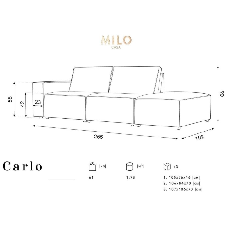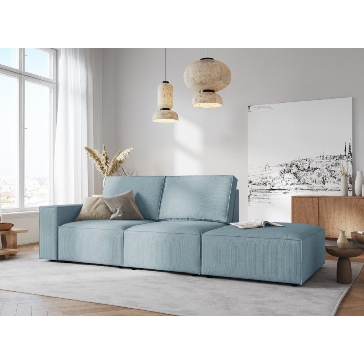 The Carlo 3-seater sofa from the Milo Casa manufacturer is a piece of furniture with dimensions: 255 cm wide, 90 cm high, 102 cm deep, which is characterised by its extreme comfort. This trendy sofa is available in 8 colours: Beige, Light Blue, Dark Blue, Grey, Light Grey, Yellow, Black and Bottle Green, so it will suit any type of interior. The seat filling is made from a combination of corrugated spring and high elasticity polyurethane foam, while the backrest is filled with foam granules and silicone. A distinctive feature of the sofa is its fashionable shape, which contributes to its high level of elegance. The sofa has been upholstered in a corduroy matt fabric that is pleasant to the touch and resistant to abrasion. The high-quality materials used in the production of the furniture make the Carlo three-seater sofa characterised by high strength and durability. The furniture is set on low, plastic legs.