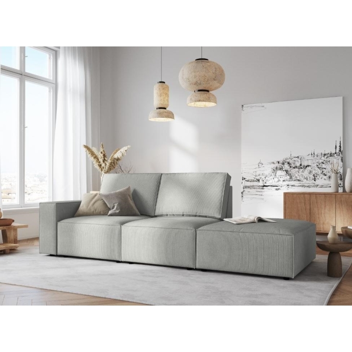 The Carlo 3-seater sofa from the Milo Casa manufacturer is a piece of furniture with dimensions: 255 cm wide, 90 cm high, 102 cm deep, which is characterised by its extreme comfort. This trendy sofa is available in 8 colours: Beige, Light Blue, Dark Blue, Grey, Light Grey, Yellow, Black and Bottle Green, so it will suit any type of interior. The seat filling is made from a combination of corrugated spring and high elasticity polyurethane foam, while the backrest is filled with foam granules and silicone. A distinctive feature of the sofa is its fashionable shape, which contributes to its high level of elegance. The sofa has been upholstered in a corduroy matt fabric that is pleasant to the touch and resistant to abrasion. The high-quality materials used in the production of the furniture make the Carlo three-seater sofa characterised by high strength and durability. The furniture is set on low, plastic legs.