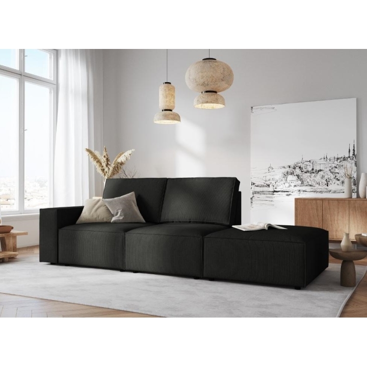 The Carlo 3-seater sofa from the Milo Casa manufacturer is a piece of furniture with dimensions: 255 cm wide, 90 cm high, 102 cm deep, which is characterised by its extreme comfort. This trendy sofa is available in 8 colours: Beige, Light Blue, Dark Blue, Grey, Light Grey, Yellow, Black and Bottle Green, so it will suit any type of interior. The seat filling is made from a combination of corrugated spring and high elasticity polyurethane foam, while the backrest is filled with foam granules and silicone. A distinctive feature of the sofa is its fashionable shape, which contributes to its high level of elegance. The sofa has been upholstered in a corduroy matt fabric that is pleasant to the touch and resistant to abrasion. The high-quality materials used in the production of the furniture make the Carlo three-seater sofa characterised by high strength and durability. The furniture is set on low, plastic legs.