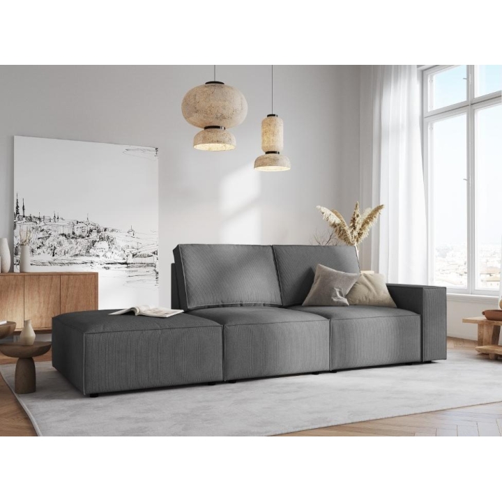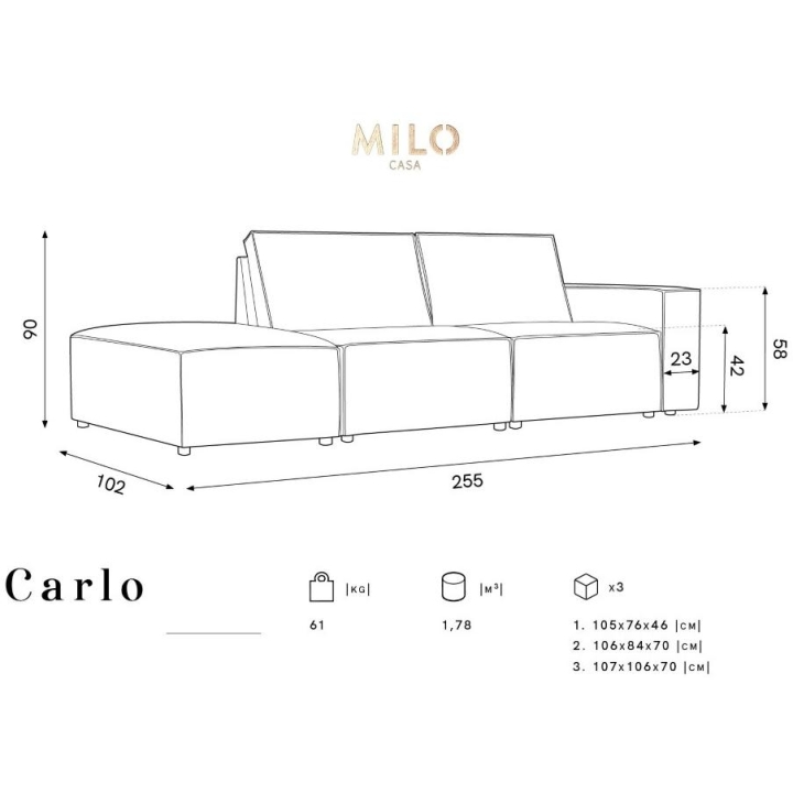 The Carlo 3-seater sofa from the Milo Casa manufacturer is a piece of furniture with dimensions: 255 cm wide, 90 cm high, 102 cm deep, which is characterised by its extreme comfort. This trendy sofa is available in 8 colours: Beige, Light Blue, Dark Blue, Grey, Light Grey, Yellow, Black and Bottle Green, so it will suit any type of interior. The seat filling is made from a combination of corrugated spring and high elasticity polyurethane foam, while the backrest is filled with foam granules and silicone. A distinctive feature of the sofa is its fashionable shape, which contributes to its high level of elegance. The sofa has been upholstered in a corduroy matt fabric that is pleasant to the touch and resistant to abrasion. The high-quality materials used in the production of the furniture make the Carlo three-seater sofa characterised by high strength and durability. The furniture is set on low, plastic legs.