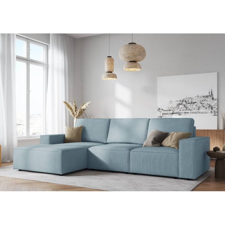 The Carlo 4-seater corner sofa from the manufacturer Milo Casa is a piece of furniture that measures: 289 cm wide, 90 cm high, 166 cm deep, which is characterised by its extreme comfort. This trendy corner sofa is available in 8 colours: Beige, Light Blue, Dark Blue, Grey, Light Grey, Yellow, Black and Bottle Green, so it will suit any type of interior. The seat filling is made from a combination of corrugated spring and high elasticity polyurethane foam, while the backrest is filled with silicone. The piece of furniture was upholstered with corduroy matt fabric, which ensures the highest comfort of relaxation and is additionally pleasant to the touch. The high quality materials used in the production of the furniture make the Carlo corner sofa characterised by high strength and durability. The furniture is set on low, plastic legs. The sofa can be manufactured on the left or on the right, so you can better adapt the furniture to your home.