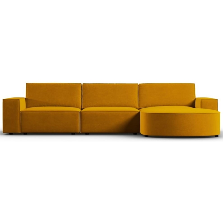 The exceptional Carlo rounded 4-seater corner sofa from the manufacturer Milo Casa is a piece of furniture that measures: 289 cm wide, 90 cm high, 166 cm deep, which is characterised by its extreme comfort. This trendy corner sofa is available in colours: Light Beige, Royal Blue, Grey, Light Grey, Yellow, Black and Bottle Green, so it will suit any type of interior. The seat filling is made from a combination of corrugated spring and high elasticity polyurethane foam, and the backrest is filled with silicone. A distinguishing feature of the corner sofa is undoubtedly its rounded backrest, which adds elegance and chic to the piece. The piece of furniture is upholstered with velvet, delicately glossy fabric, nice and pleasant to the touch, which ensures the highest comfort of rest, and is additionally resistant to abrasion. The high quality materials used in the production of the furniture make the Carlo corner sofa characterised by high strength and durability. The furniture is set on low, plastic legs. The sofa can be manufactured on the left or on the right, so you can better adapt the furniture to your home.