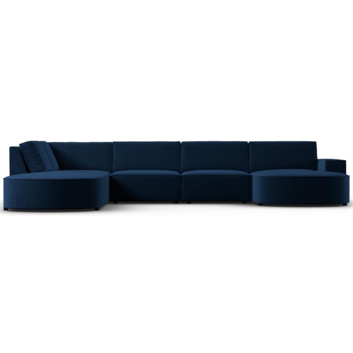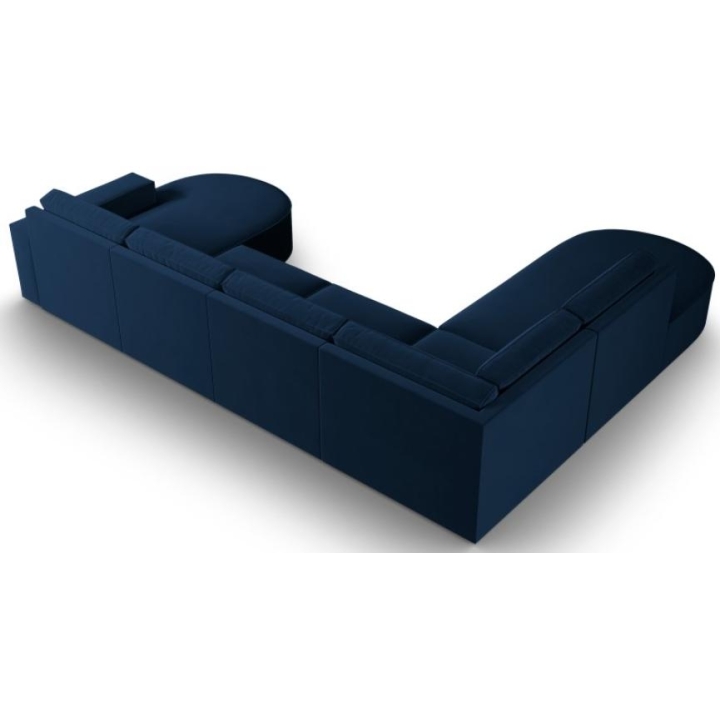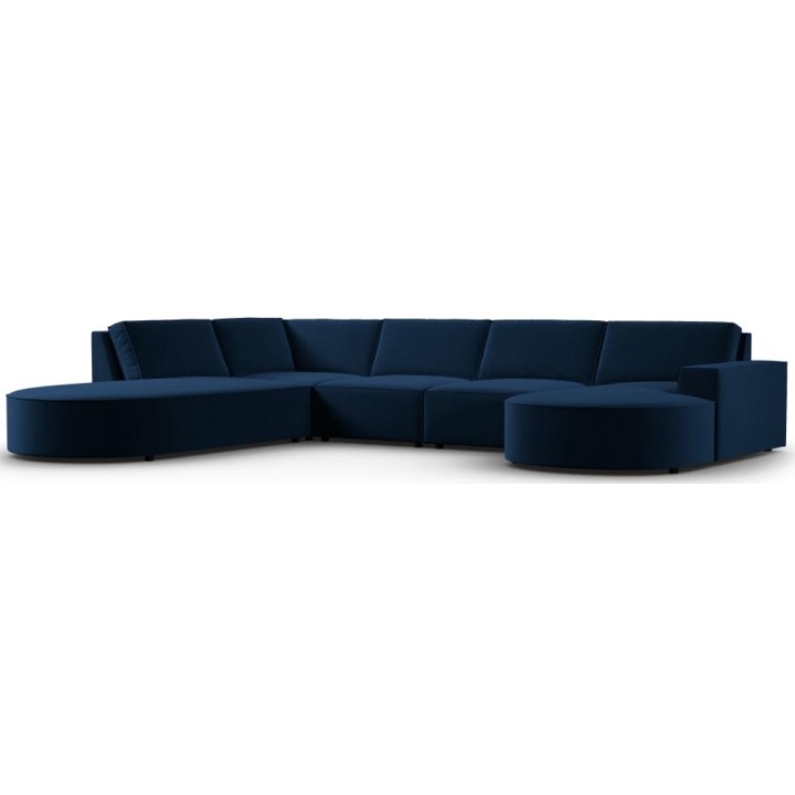 The modern Carlo rounded 5-seater panoramic sofa from the manufacturer Milo Casa is a piece of furniture that measures: 368 cm wide, 90 cm high, 262 cm deep on one side and 160 cm on the other, which is characterised by its extreme comfort. This trendy corner sofa is available in 7 colours: Light Beige, Royal Blue, Grey, Light Grey, Yellow, Black and Bottle Green, so it will suit any type of interior. The seat filling is made from a combination of corrugated spring and high elasticity polyurethane foam, while the backrest is filled with silicone. A distinctive feature of the sofa is its unusual, futuristic shape - the body resembles the letter "U", making it a perfect piece of furniture for social gatherings. The sofa is upholstered with velvet softly glossy fabric, nice and pleasant to the touch, which ensures the highest comfort of rest, and is additionally resistant to abrasion. The high quality materials used in the production of the furniture make the Carlo panoramic sofa characterised by high strength and durability. The furniture is set on low, plastic legs. The longer lounger can be manufactured on the left or right side, allowing you to better adapt the furniture to your home.