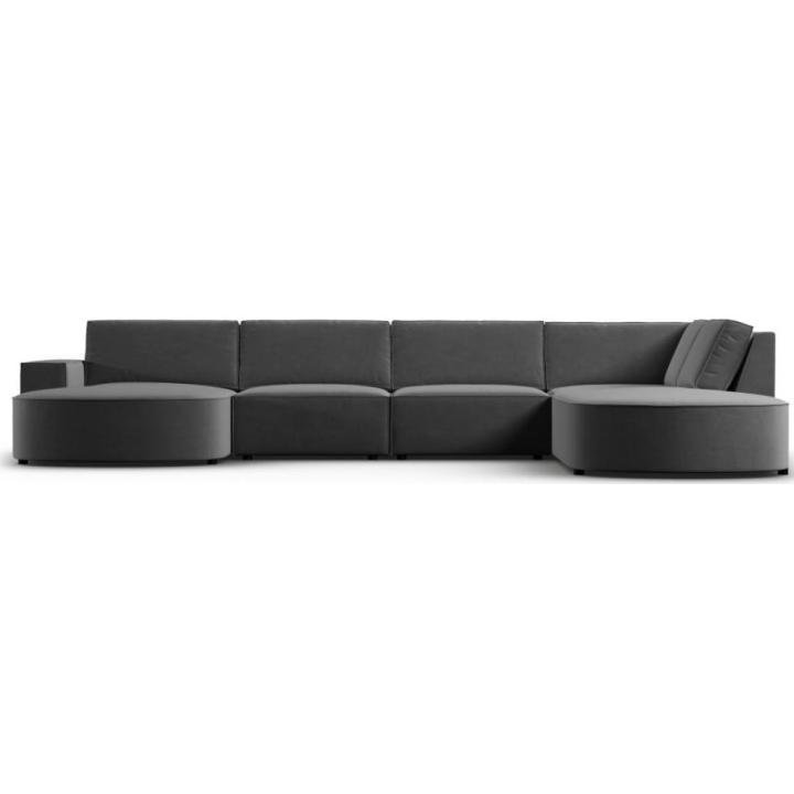The modern Carlo rounded 5-seater panoramic sofa from the manufacturer Milo Casa is a piece of furniture that measures: 368 cm wide, 90 cm high, 262 cm deep on one side and 160 cm on the other, which is characterised by its extreme comfort. This trendy corner sofa is available in 7 colours: Light Beige, Royal Blue, Grey, Light Grey, Yellow, Black and Bottle Green, so it will suit any type of interior. The seat filling is made from a combination of corrugated spring and high elasticity polyurethane foam, while the backrest is filled with silicone. A distinctive feature of the sofa is its unusual, futuristic shape - the body resembles the letter "U", making it a perfect piece of furniture for social gatherings. The sofa is upholstered with velvet softly glossy fabric, nice and pleasant to the touch, which ensures the highest comfort of rest, and is additionally resistant to abrasion. The high quality materials used in the production of the furniture make the Carlo panoramic sofa characterised by high strength and durability. The furniture is set on low, plastic legs. The longer lounger can be manufactured on the left or right side, allowing you to better adapt the furniture to your home.