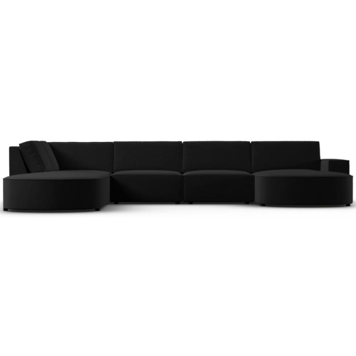 The modern Carlo rounded 5-seater panoramic sofa from the manufacturer Milo Casa is a piece of furniture that measures: 368 cm wide, 90 cm high, 262 cm deep on one side and 160 cm on the other, which is characterised by its extreme comfort. This trendy corner sofa is available in 7 colours: Light Beige, Royal Blue, Grey, Light Grey, Yellow, Black and Bottle Green, so it will suit any type of interior. The seat filling is made from a combination of corrugated spring and high elasticity polyurethane foam, while the backrest is filled with silicone. A distinctive feature of the sofa is its unusual, futuristic shape - the body resembles the letter "U", making it a perfect piece of furniture for social gatherings. The sofa is upholstered with velvet softly glossy fabric, nice and pleasant to the touch, which ensures the highest comfort of rest, and is additionally resistant to abrasion. The high quality materials used in the production of the furniture make the Carlo panoramic sofa characterised by high strength and durability. The furniture is set on low, plastic legs. The longer lounger can be manufactured on the left or right side, allowing you to better adapt the furniture to your home.